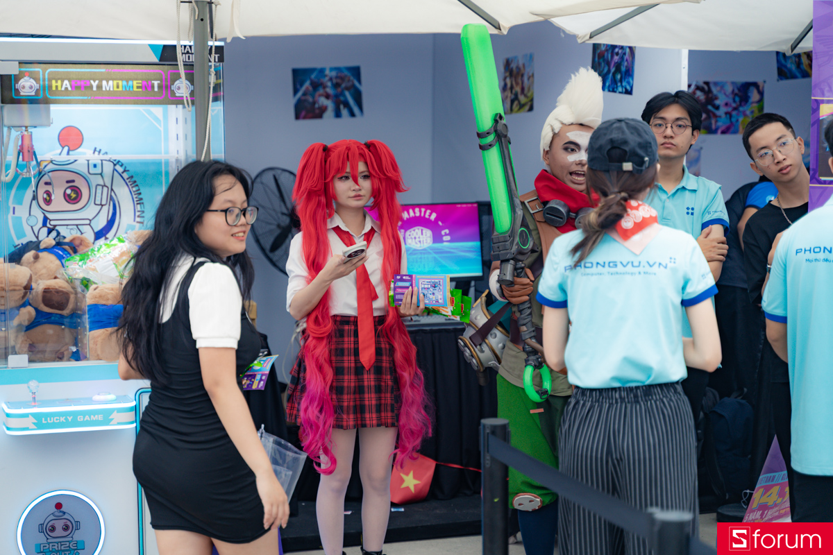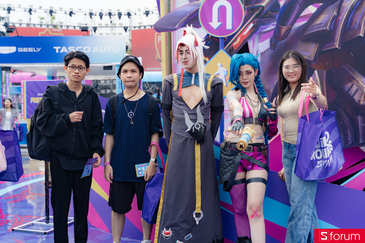 Cạnh đó là sân khấu phụ, nơi liên tục diễn ra các hoạt động giao lưu, cosplay và minigame. Những màn catwalk cosplay được đầu tư kỹ lưỡng đã khiến khán giả vỡ òa. Dàn cosplayer hóa thân thành Ahri, Jinx, Yasuo, Katarina,… bước ra với trang phục chỉn chu và phong thái tự tin thu hút rất nhiều người xem, thậm chí bám sát sân khấu để chụp ảnh từng khoảnh khắc.
