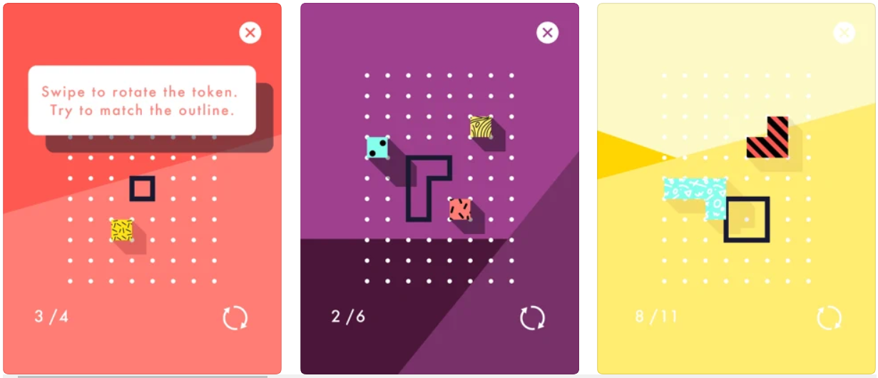 Mục đích là di chuyển và xoay các mảnh ghép để chúng khớp với hình dạng mục tiêu. Đối với những màn chơi hoàn hảo, bạn sẽ được thưởng một ngôi sao để bạn có thể mở khóa các màn chơi mới.