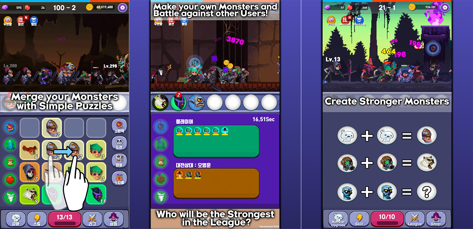 Hợp nhất những con quái vật của bạn với những câu đố đơn giản và tạo ra những con quái vật mạnh hơn. Tạo quái vật của riêng bạn bằng cách hợp nhất tất cả các loại quái vật! Tạo quái vật của riêng bạn và chiến đấu chống lại những người dùng khác! Đạt đến vị trí hàng đầu trong các trò chơi liên minh được xếp hạng và nhận phần thưởng!
