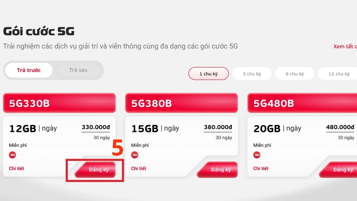 - Bước 3: Đăng nhập xong, bạn lướt xem danh sách các gói tháng 4G/5G hiện hành, chọn gói ưng ý nhất và nhấn nút Đăng ký.