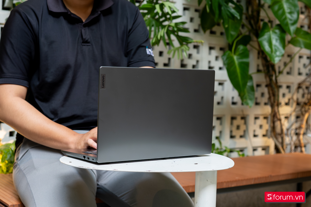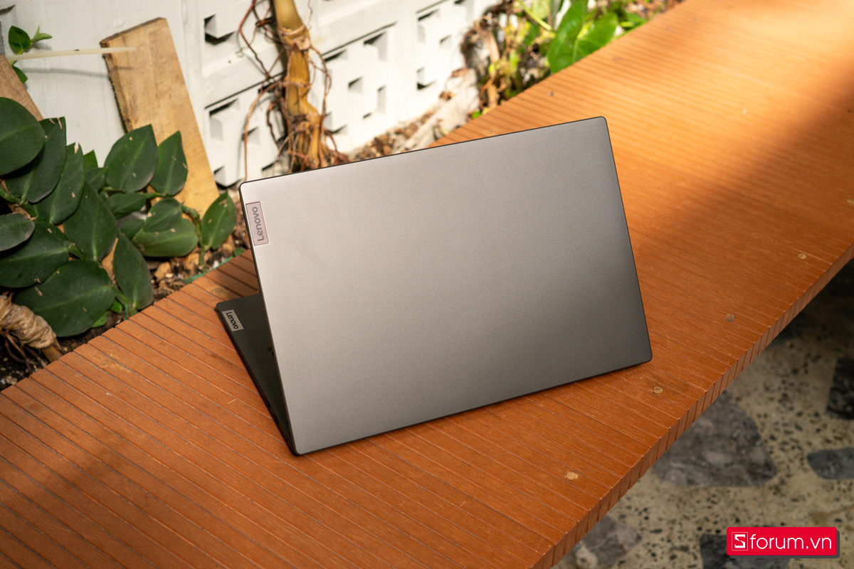 V15 G5 IRL giữ phong cách laptop văn phòng truyền thống, vỏ nhựa nhám, ít bám vân tay, bản lề chắc chắn. Trọng lượng 1.61 kg là chấp nhận được với một chiếc 15.6 inch. Trên mặt lưng của máy có dòng chữ Lenovo được cách điệu cho nổi bật hơn.