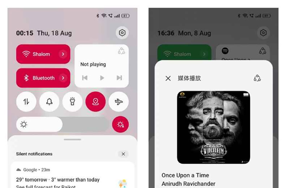 Quan trọng nhất, ColorOS 13 xuất hiện với một Control Center được thiết kế lại. Phần trên cùng có hai nút chuyển lớn ở bên trái và widget điều khiển phát đa phương tiện ở bên phải. Theo mặc định, các nút bật tắt lớn là WiFi và Bluetooth nhưng người dùng có thể thay đổi theo sở thích của mình.