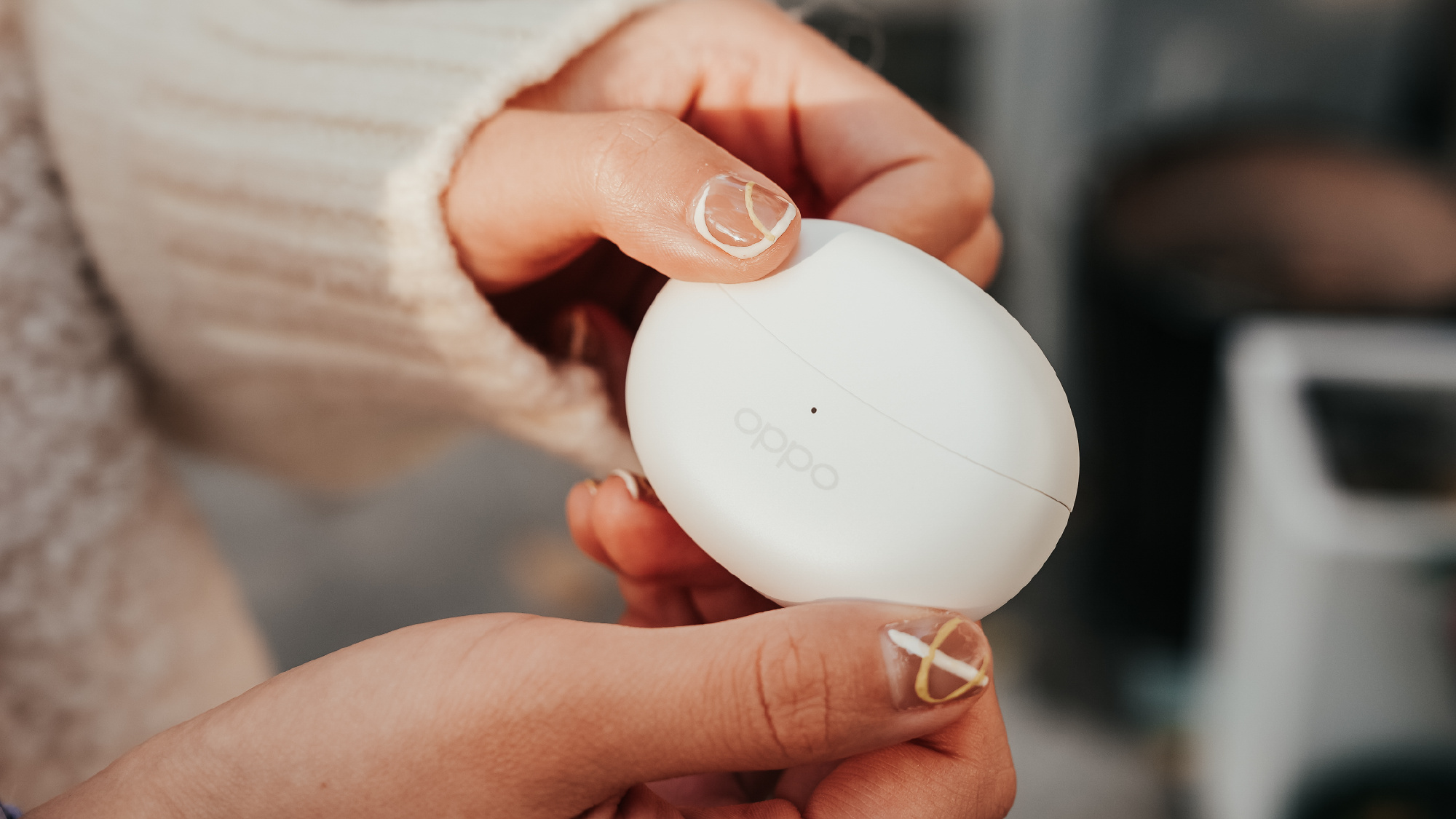 OPPO Enco R Pro có vỏ hộp sạc hoàn thiện từ chất liệu nhựa nhám mờ, chống xước và chống bám mồ hôi cũng như dấu vân tay. Hộp sạc có dạng hình tròn nhỏ, mặt trước in logo OPPO quen thuộc, đèn LED thông báo trạng thái và thời lượng pin, mặt dưới là nơi đặt cổng sạc USB-C. Bản lề hộp sạc làm từ kim loại chắc chắn, không ọp ẹp. Thiết kế hộp sạc gần như thay đổi so với phiên bản Enco R tiêu chuẩn ra mắt cách đây nửa năm.