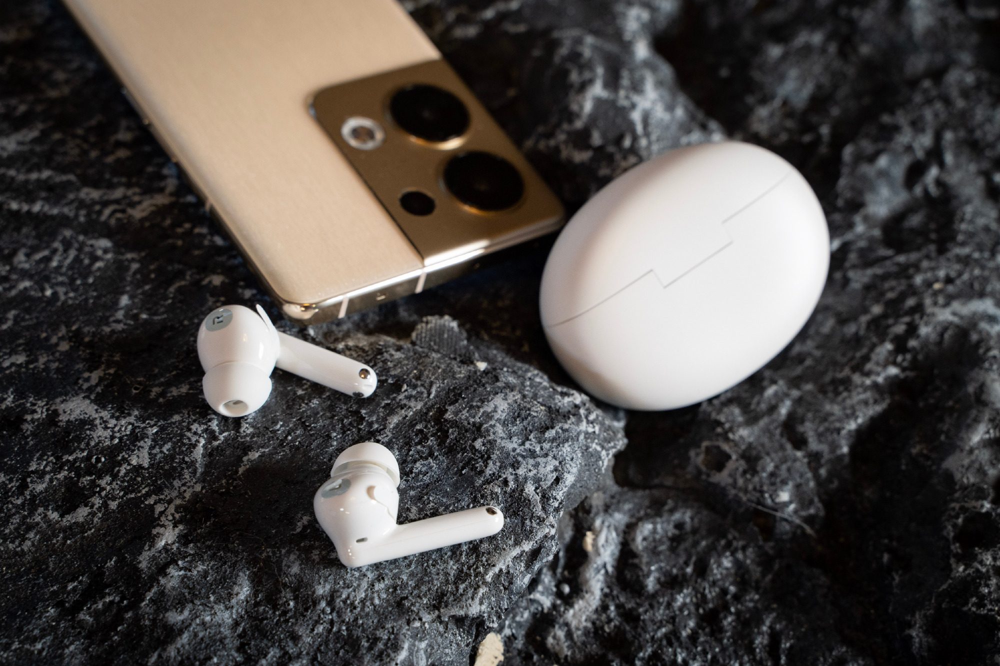 Bên trong là hai tai nghe sử dụng thiết kế in-ear với đuôi tai dài, housing được thiết kế nghiêng một góc nhỏ để cho cảm giác đeo trên tai thoải mái. Mỗi bên tai nghe đều có kí hiệu L hoặc R tương ứng để người dùng nhận biết được tai nghe nào sẽ đeo cho bên tai nào.