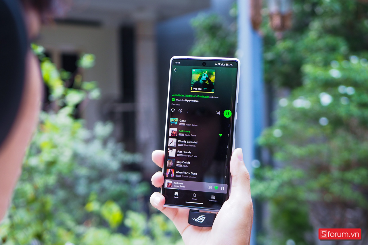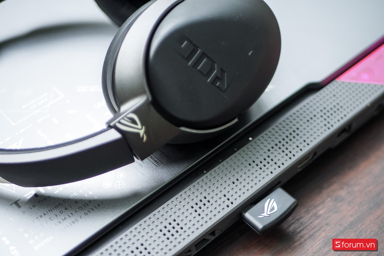 Bề mặt của của củ tai có sự xuất hiện của logo ROG được khắc nổi lên bề mặt, chất liệu của bề mặt được xử lý nhám, tuy nhiên khi sử dụng rất dễ bám bụi bẩn và dấu tay, anh em khi sử dụng cần lưu ý vệ sinh sạch sẽ. Tuy nhiên do bề mặt hơi nhám nên cũng rất dễ bị xước.