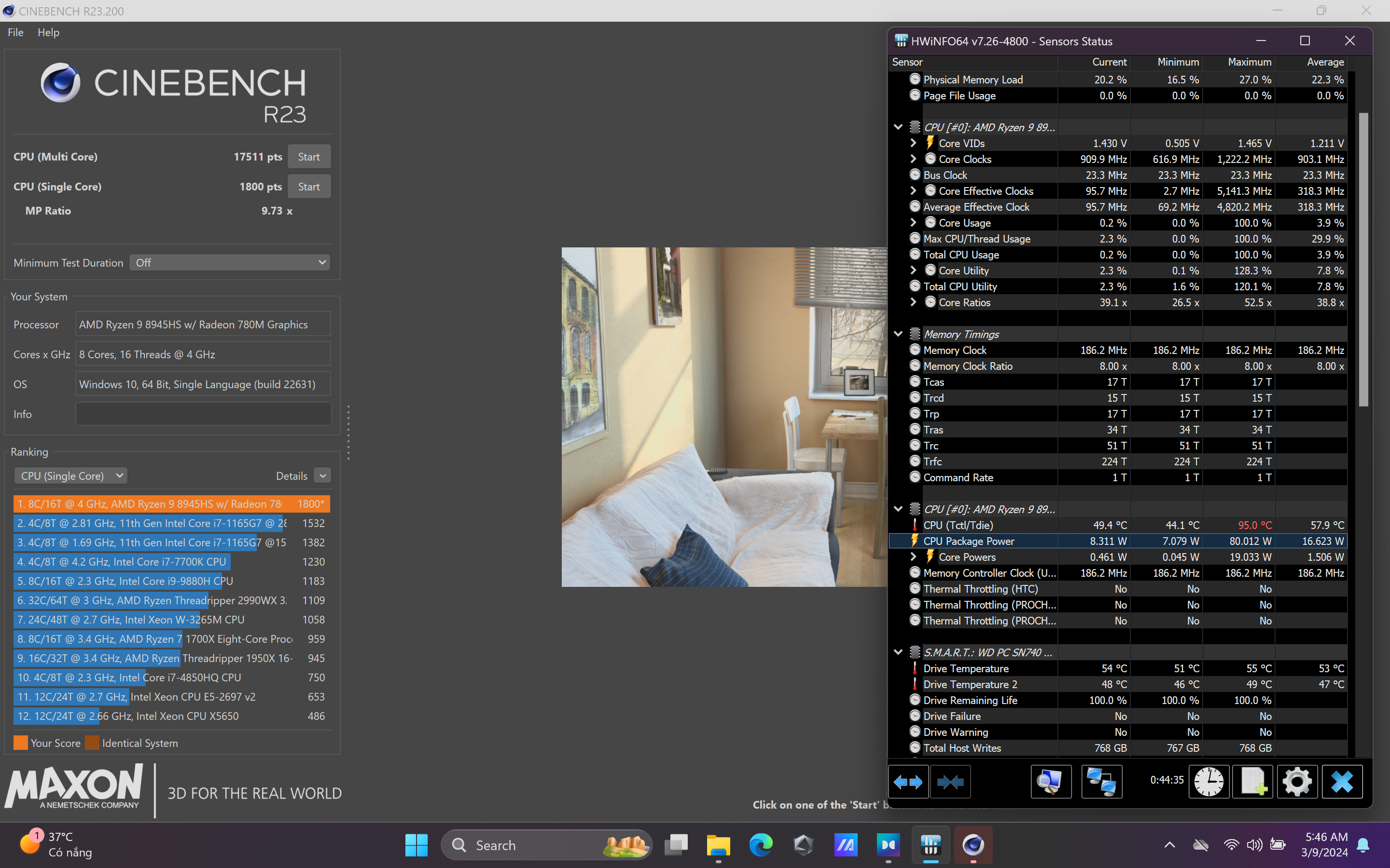 AMD Ryzen 9 8945HS về cơ bản chỉ là bản nâng cấp nhỏ của AMD Ryzen 9 7940HS với 8 nhân 16 luồng, kiến trúc Zen 4, sản xuất trên tiến trình 4nm, tích hợp GPU Radeon 780M. Nâng cấp đáng kể nhất chỉ có NPU (AMD gọi là Ryzen AI) có sức mạnh tăng từ 10 TOPs lên 16 TOPs. Khi kết hợp cả CPU + GPU tích hợp + NPU thì tổng sức mạnh xử lý cho các tác vụ AI là 39 TOPs.