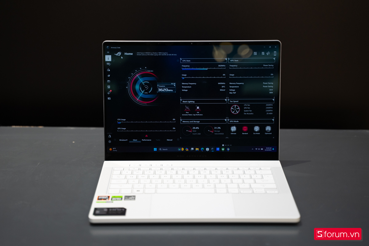 Nói kỹ hơn một chút về cấu hình của ASUS Zephyrus G14 phiên bản cấu hình ở thị trường Việt Nam. Laptop được trang bị CPU AMD Ryzen 9 8945HS đi kèm GPU RTX 4050, 32GB RAM LPDDR5X 6400 (không thể nâng cấp) và 512GB SSD.