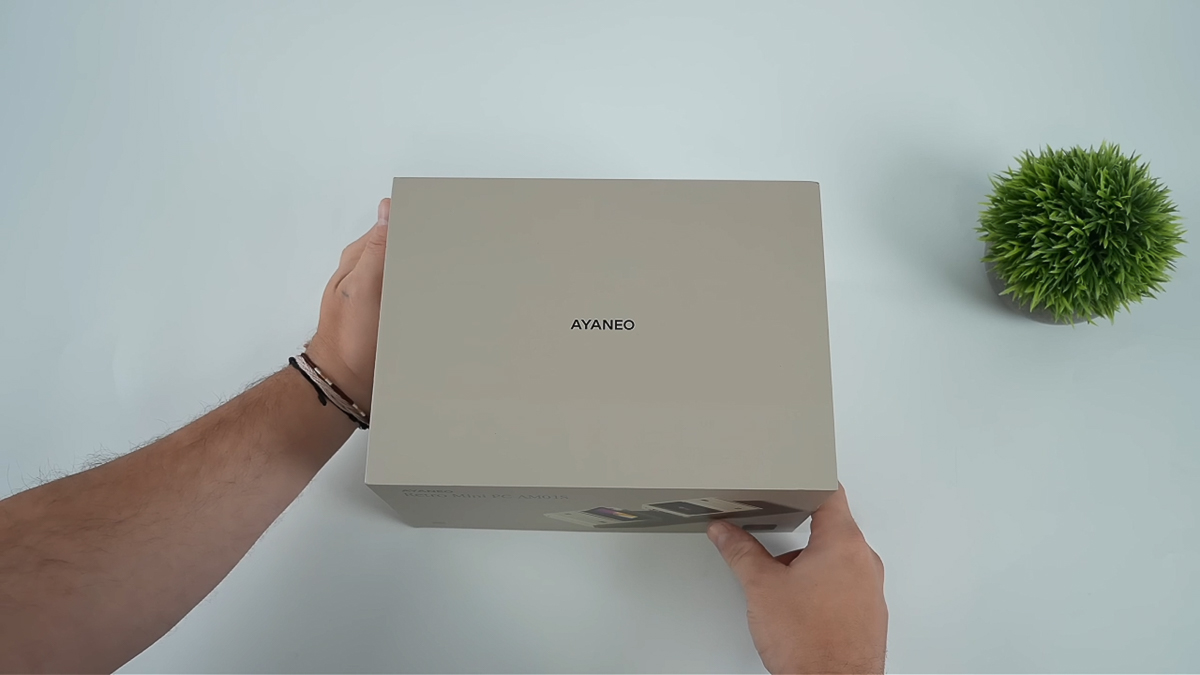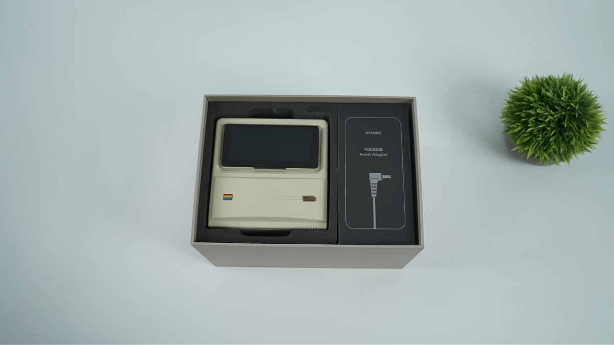 Đúng với ngôn ngữ tạo hình retro, AYANEO AM01S đem lại cảm giác cổ điển ngay từ phần đóng hộp với tone màu “Beige” trầm ấm. Mở hộp, đầu tiên chúng ta sẽ thấy một tấm giấy cover in hình 2D. Ngay bên dưới là chiếc Mini PC của chúng ta AYANEO AM01S và kế bên là hộp đựng phụ kiện.