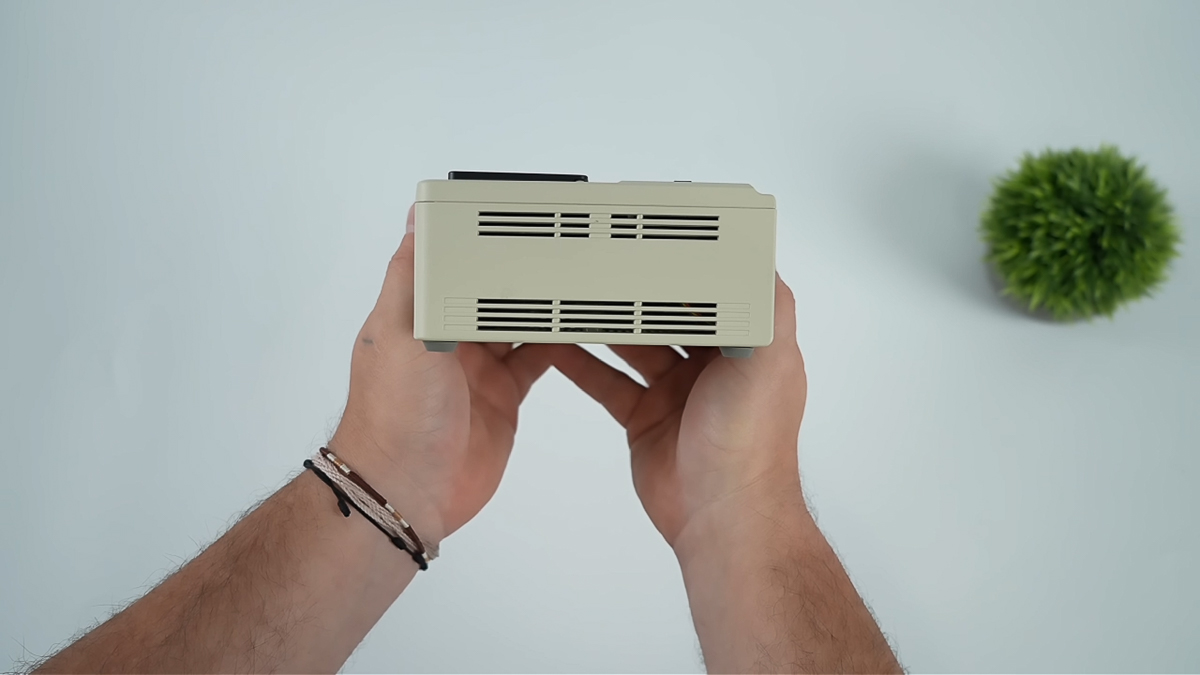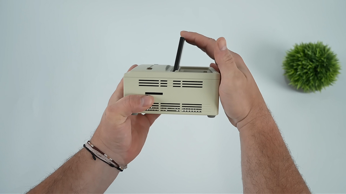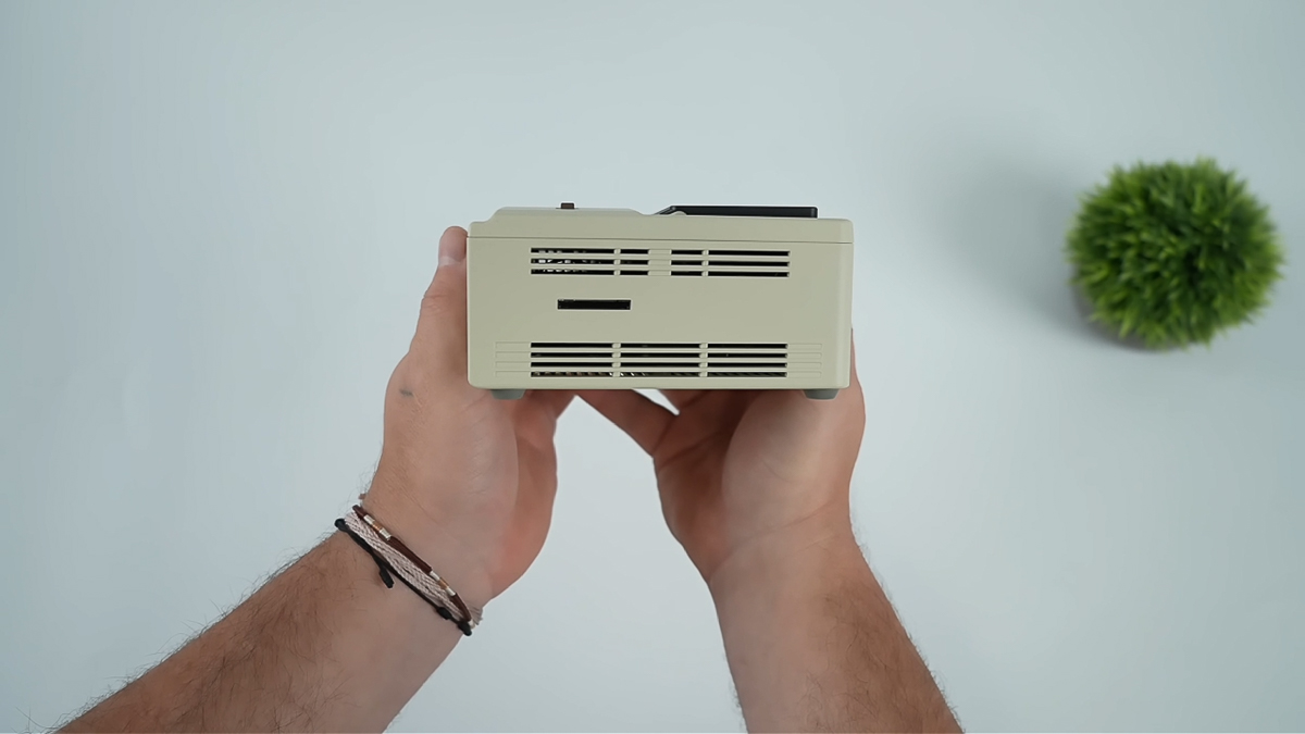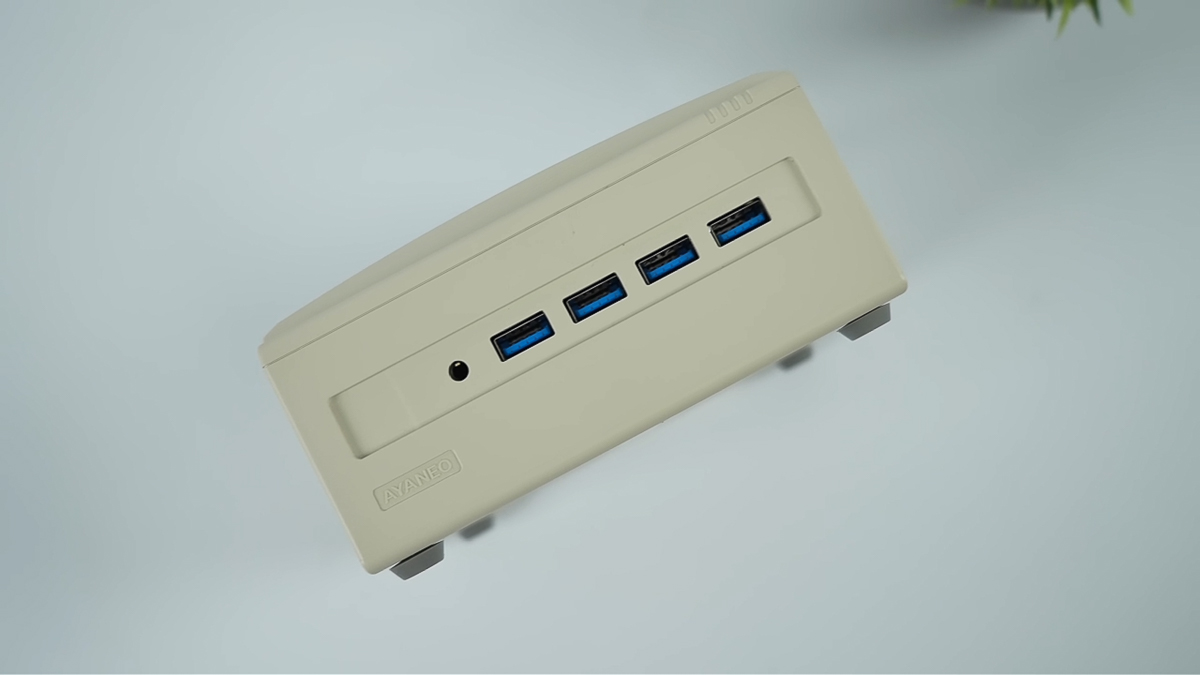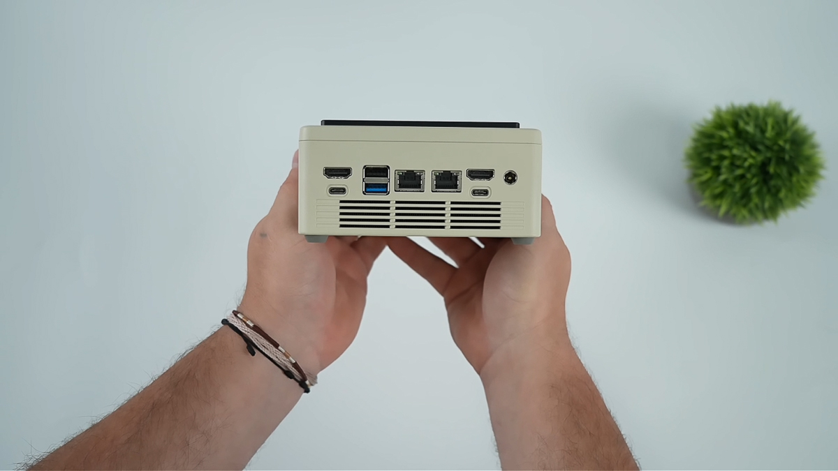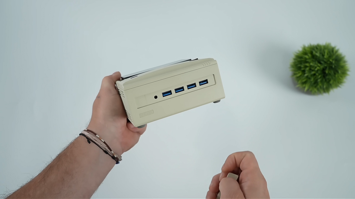 Toàn bộ phần vỏ của AYANEO AM01S được làm bằng nhựa với tone màu “Beige” đậm chất cổ điển. Hai cạnh xung quanh và mặt đáy của Mini PC có rất nhiều khe lưới thoát nhiệt đảm bảo khả năng tản nhiệt tốt.