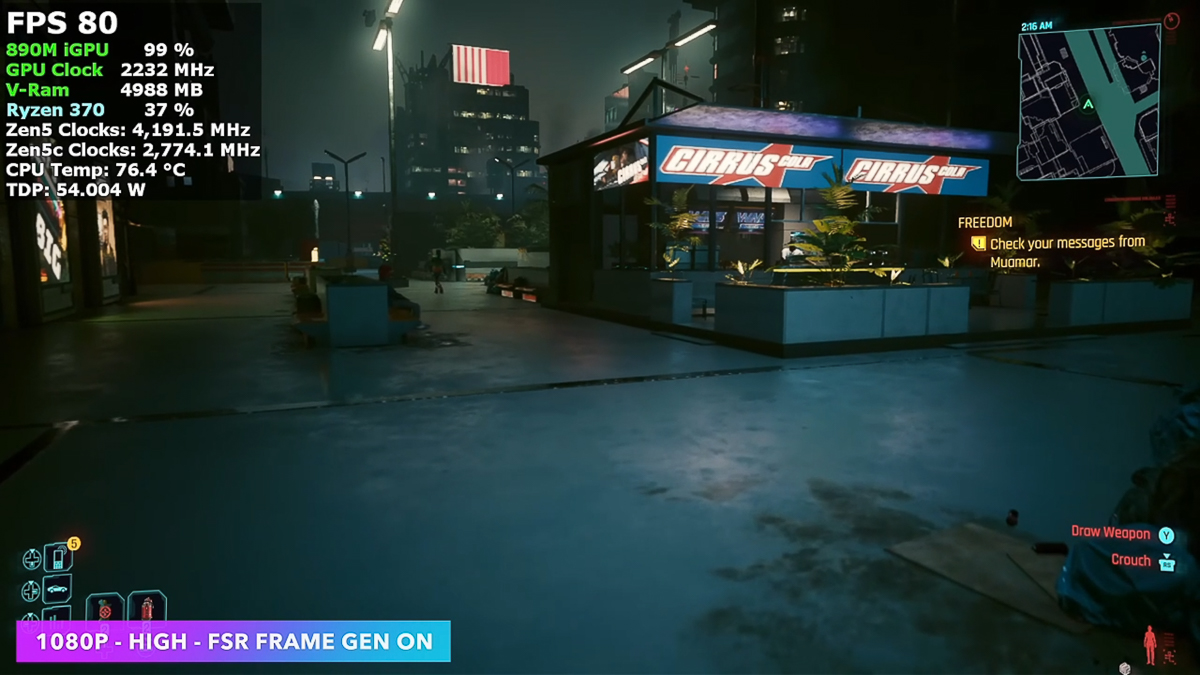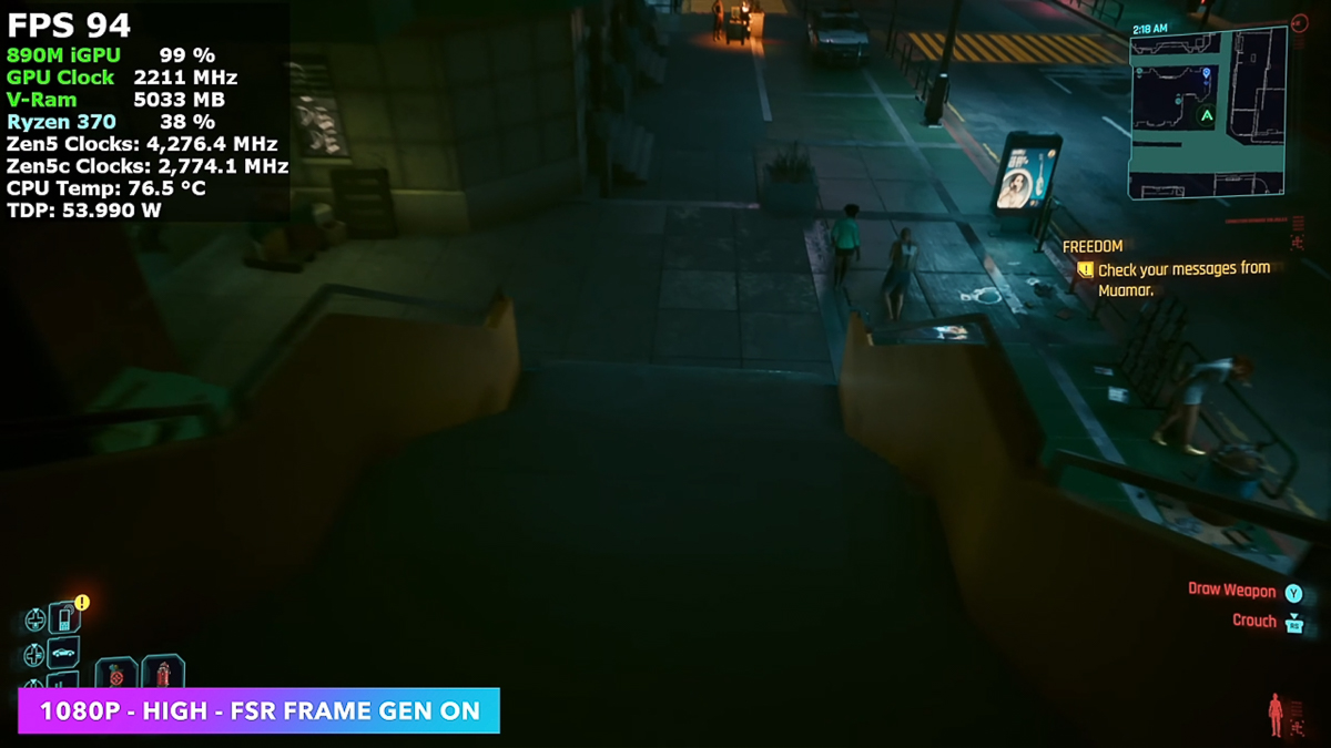 Chơi thử tựa game Cyberpunk 2077 với độ phân giải Full HD và cài đặt setting là High, tính năng FSR tăng tốc độ khung hình trong game cũng được bật. Mình đã có trải nghiệm chơi tựa game này với FPS ổn định trong ngưỡng từ 74 - 93 rất mượt mà. CPU AMD Ryzen AI 9 HX 370 hoạt động ở ngưỡng công suất 39%, nhiệt độ 76 độ C khá mát mẻ, TDP ở mức 54W; và iGPU Radeon 890M cũng hoạt động 99% công suất.