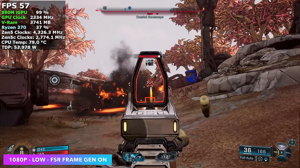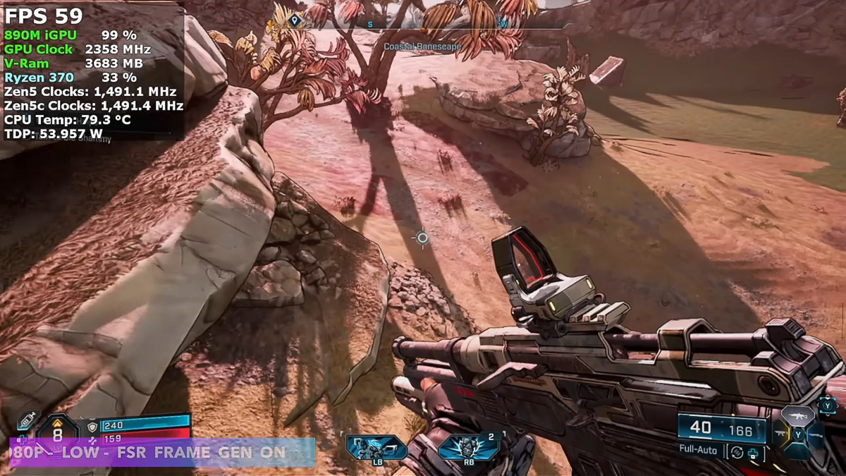 Cuối cùng là Borderlands 4, vì đây là một tựa game khá nặng và hiệu năng của Radeon 890M chưa đủ để đáp ứng tốt nhất. Nên mình đã giảm mức cài đặt xuống còn Low mà thôi, nhưng tính năng FSR vẫn được bật. Kết quả, dù đồ họa không quá nịnh mắt, nhưng đánh đổi lại trải nghiệm chơi rất ổn áp với mức FPS dao động từ 50 cho đến 60 khá mượt mà.