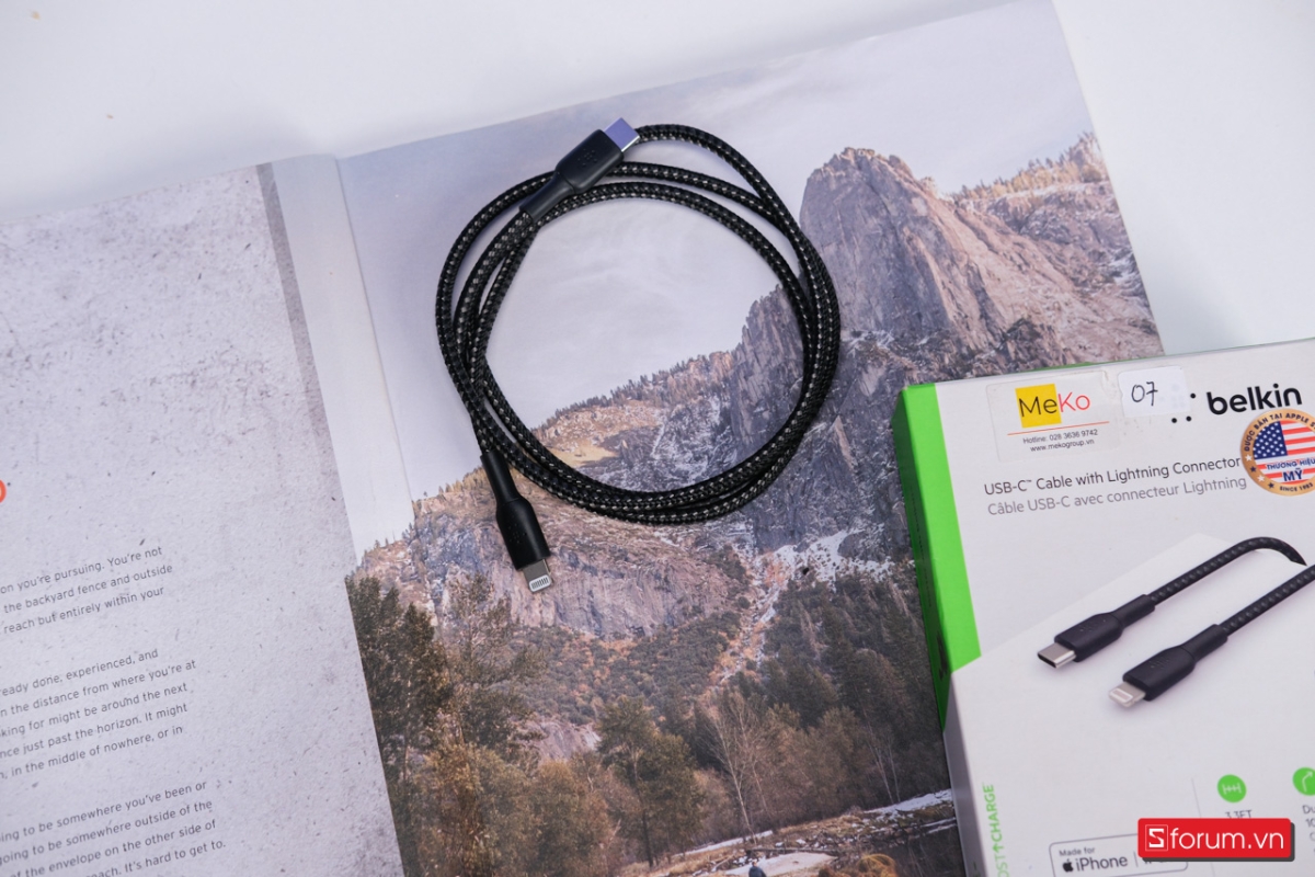 Cuối cùng là cáp Belkin USB-C to Lightning dành cho những người dùng không nỡ rời xa chiếc iPhone Lightning của mình. Vỏ hộp mỏng, in hình sợi cáp màu đen chắc chắn. Belkin nhấn mạnh độ bền với khả năng chịu tới 10.000+ lần gập, đảm bảo tuổi thọ cao.