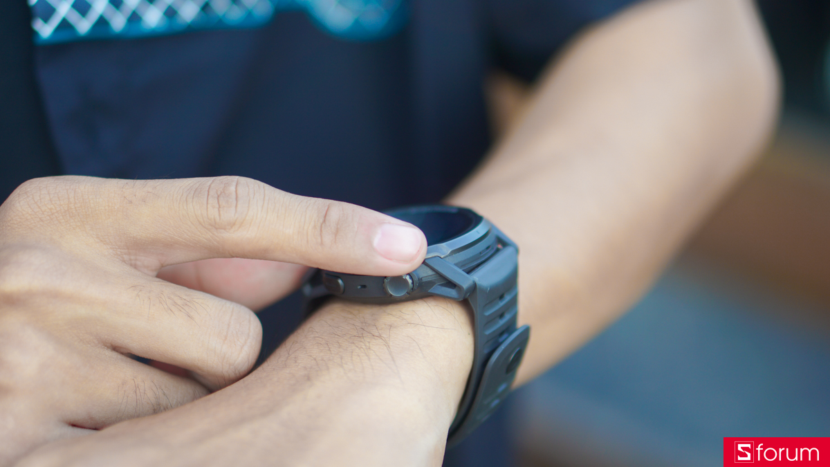 Cạnh phải của đồng hồ là vị trí của núm xoay và nút back, giúp thao tác với giao diện nhanh và chính xác, hữu ích khi tập luyện ngoài trời. Nút Action ở cạnh trái cho phép người dùng đánh dấu vòng tập cũng như gán các chức năng phụ.