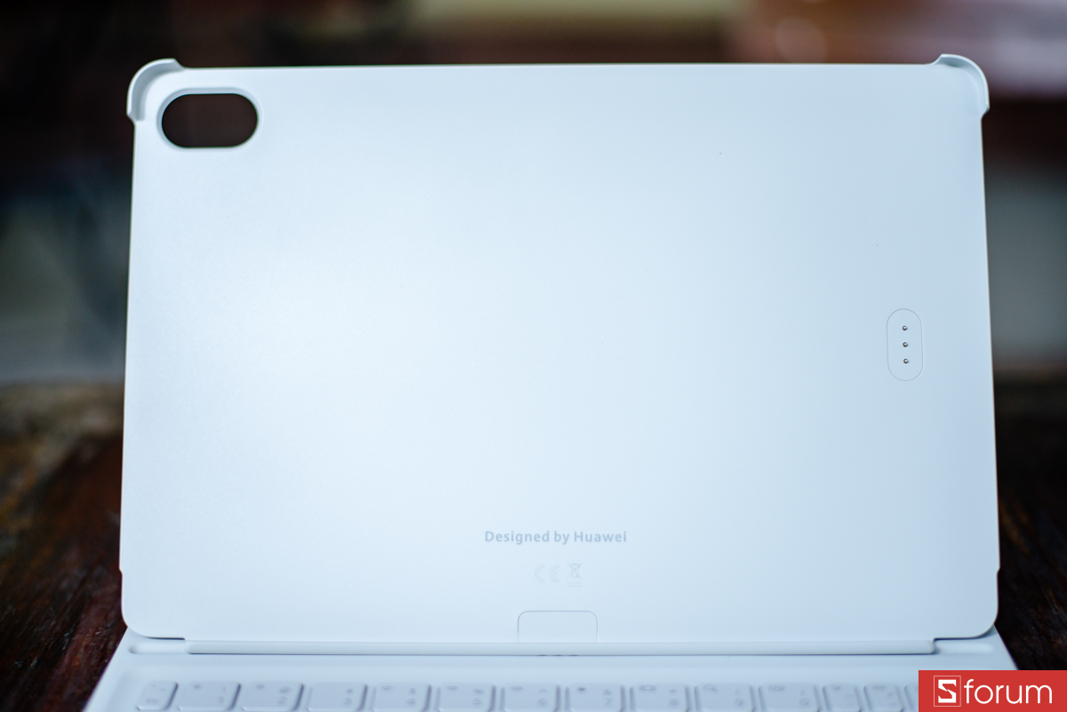 Máy được hoàn thiện từ khung nhôm nguyên khối với bề mặt nhám mờ, mặt lưng có lớp phủ nhám giúp hạn chế bám vân tay hiệu quả, đồng thời tạo cảm giác cầm nắm chắc chắn và không bị trơn trượt. Logo Huawei được đặt chính giữa, giữ được sự cân đối và tinh tế, phía dưới có các chấm nam châm để kết nối với bàn phím.