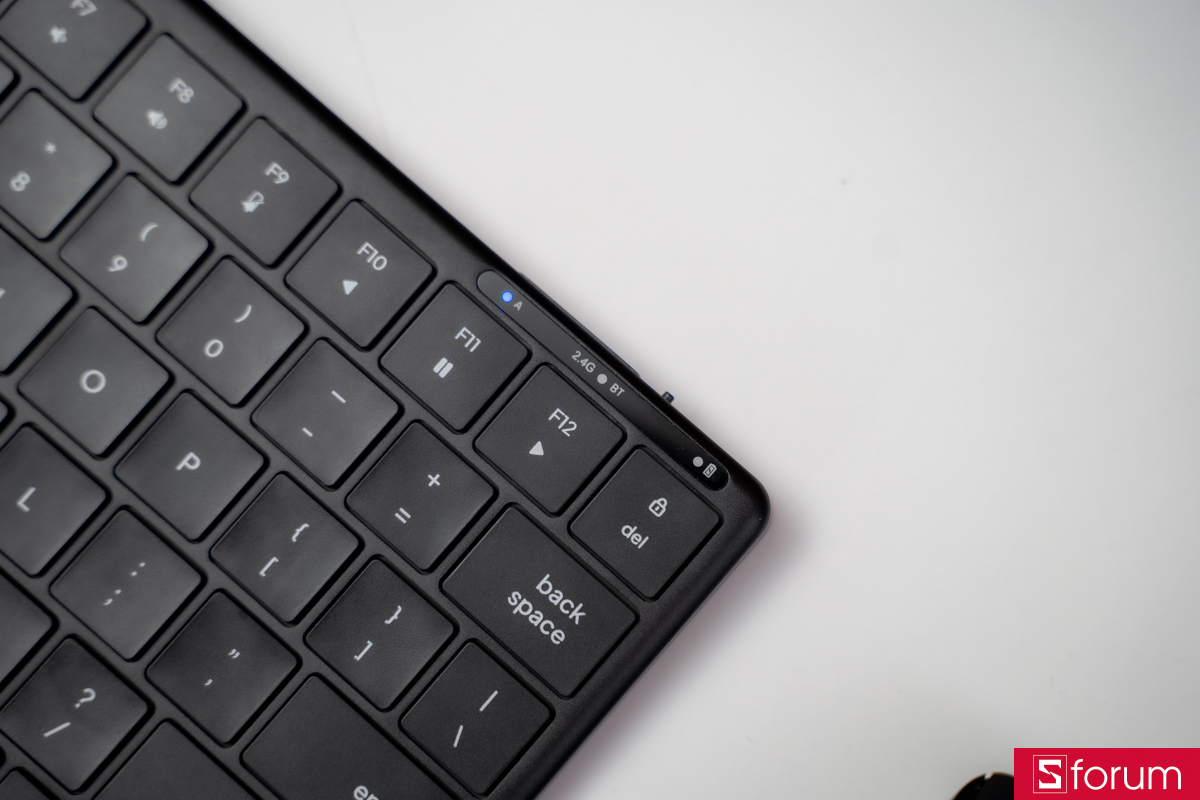 Ở góc trên của bàn phím là khu vực hiển thị trạng thái, giúp người dùng dễ dàng theo dõi trong quá trình sử dụng. Ký hiệu A cho biết tình trạng Caps Lock đang bật hay tắt, trong khi 2.4G và BT thể hiện chế độ kết nối hiện tại của bàn phím. Cuối cùng là đèn báo pin, giúp bạn nắm được mức pin còn lại để chủ động sạc, tránh gián đoạn khi đang làm việc hay giải trí.