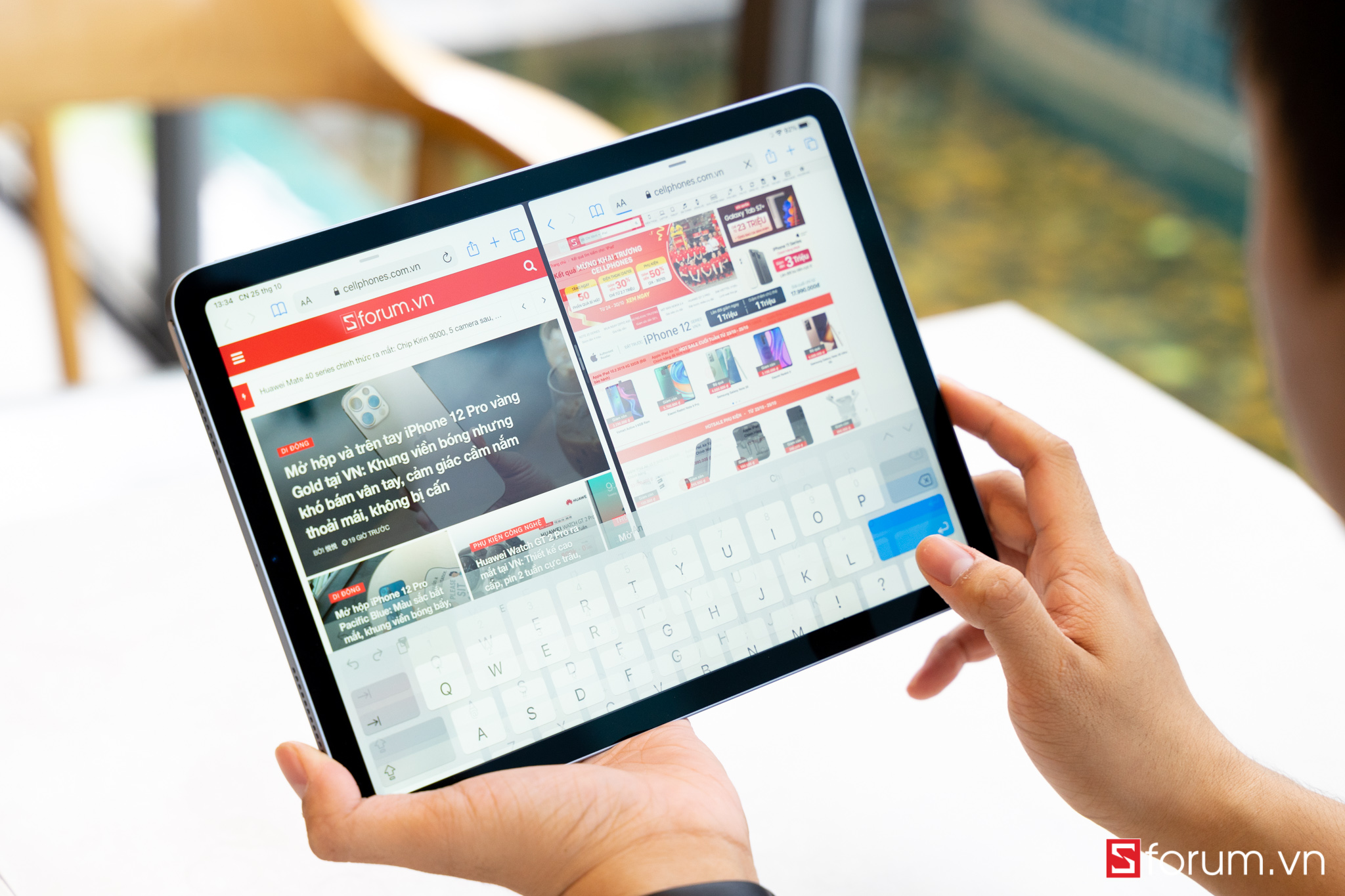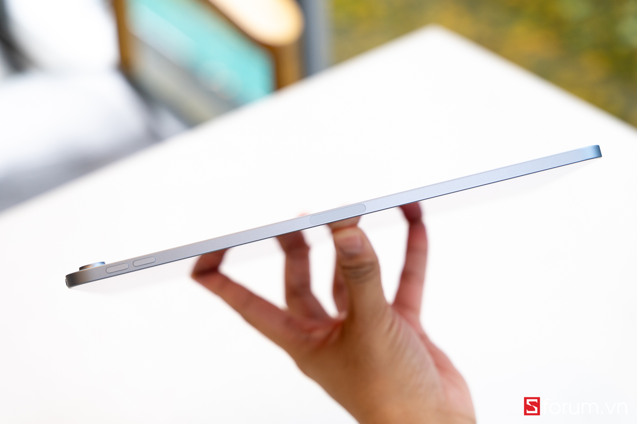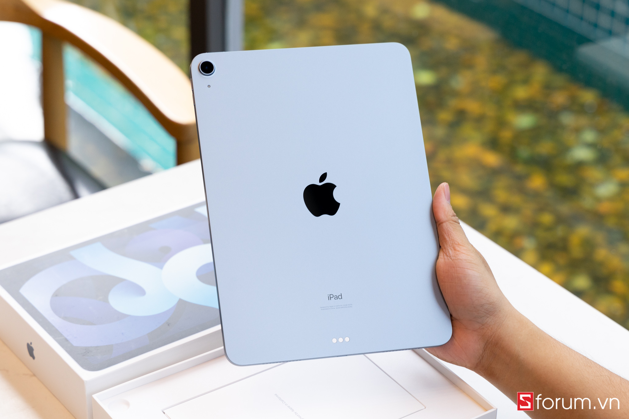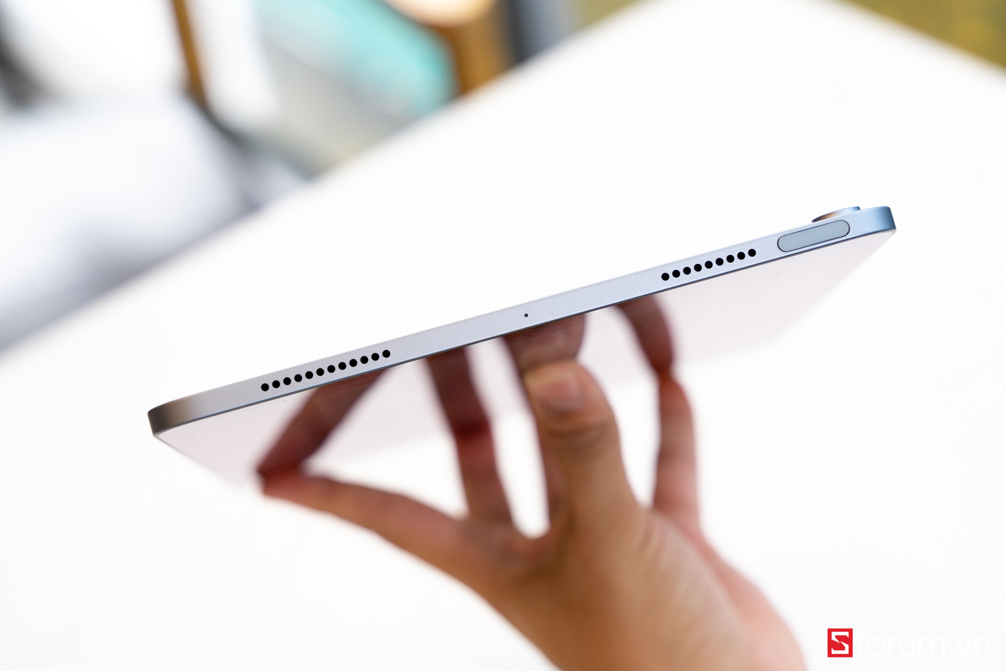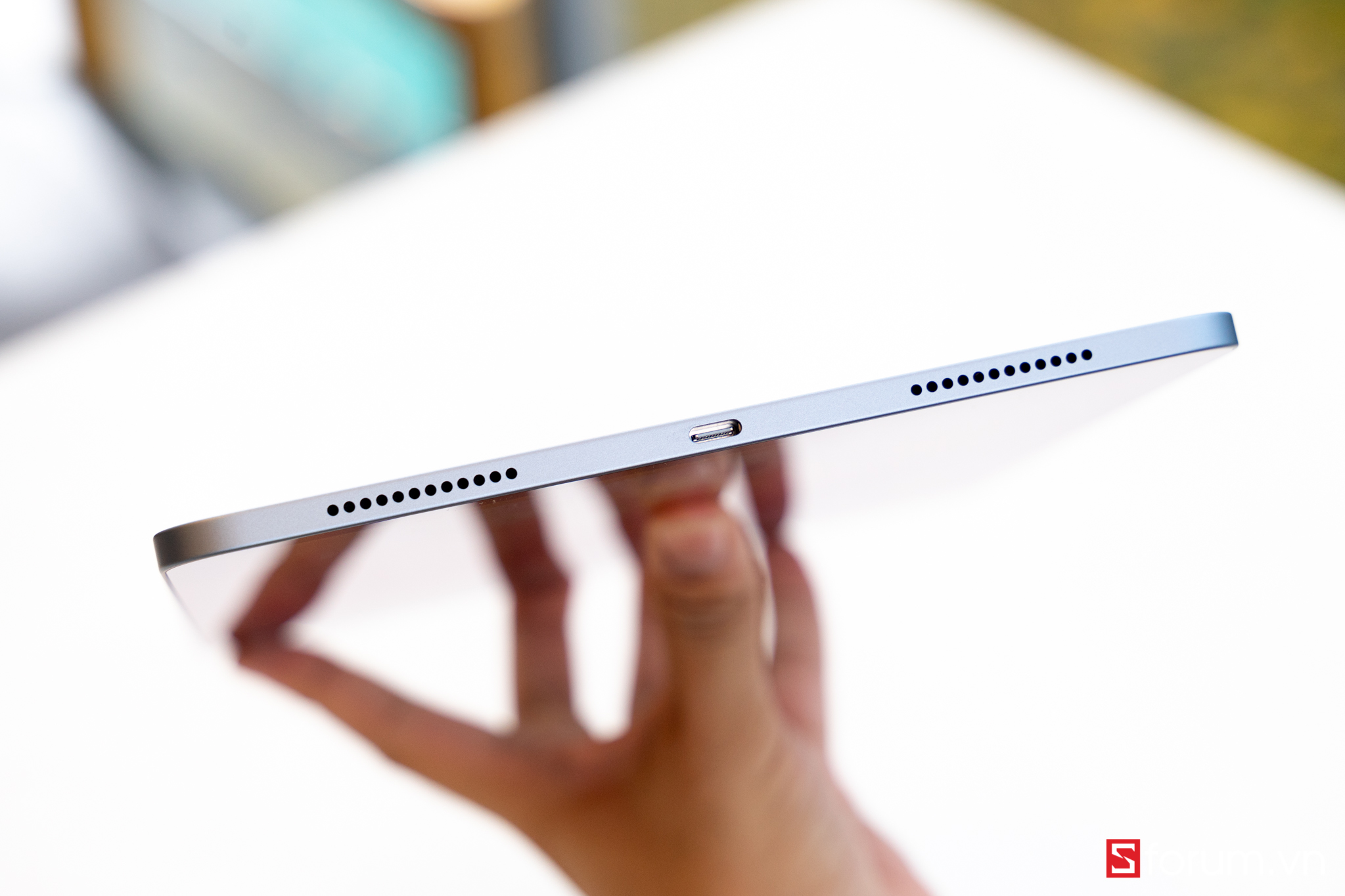 Tại sự kiện Time Flies, Apple đã giới thiệu nhiều dòng sản phẩm tiếp nối ấn tượng, trong đó có iPad Air 4 - chiếc iPad Air với thiết kế tương tự như iPad Pro.Vậy iPad Air 4 vừa ra mắt của Apple có gì đặc biệt? Hãy cùng Sforum.vn trên tay nhanh sản phẩm này nhé!Đầu tiên khi cầm máy, mình khá ấn tượng với kiểu thiết kế vuông của nó. Đặc biệt năm nay Apple ra hẳn 5 màu: Bạc, Vàng hồng, xám, xanh lá, xanh da trời thay vì 3 màu cơ bản như những năm trước. Ở đây mình có máy màu xanh và vàng hồng.Nhìn chung ngoại hình máy gần như chiếc iPad Pro 2018, tuy nhiên viền màn hình có dày hơn một chút và không có Face ID. Cạnh dưới máy bao gồm 2 loa và cổng sạc Type-C; cạnh phải có khay sim (bản 4G), vị trí sạc Apple Pencil 2, phím âm lượng; cạnh trên có loa và Touch ID.