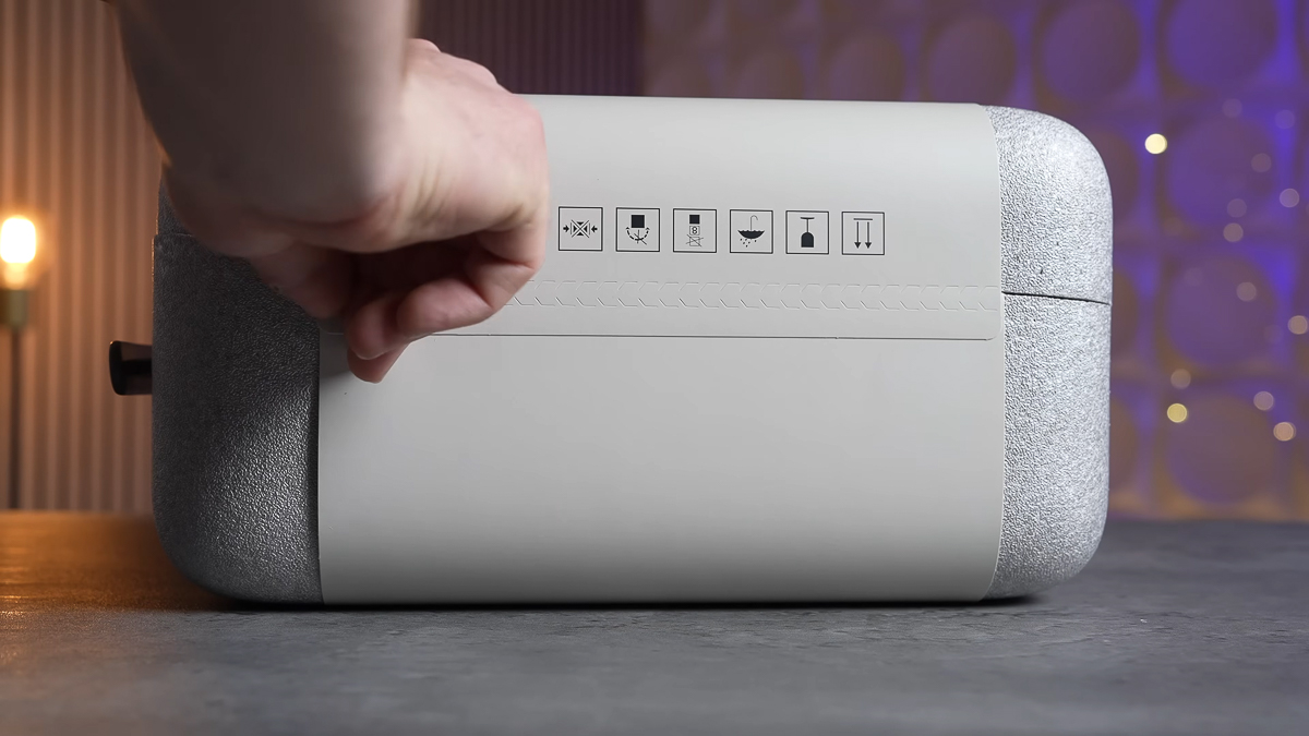 JMGO N1S 4K là một trong những mẫu máy chiếu cao cấp có phần vỏ hộp bắt mắt nhất từ trước tới nay mình từng cầm trên tay. Thiết kế theo dạng một lớp vỏ trứng ghép đôi lại, làm bằng vật liệu mút xốp đặc, cứng, chống sốc va đập tốt. Cầm trên tay cũng khá đầm nặng nhưng rất gọn nhẹ.