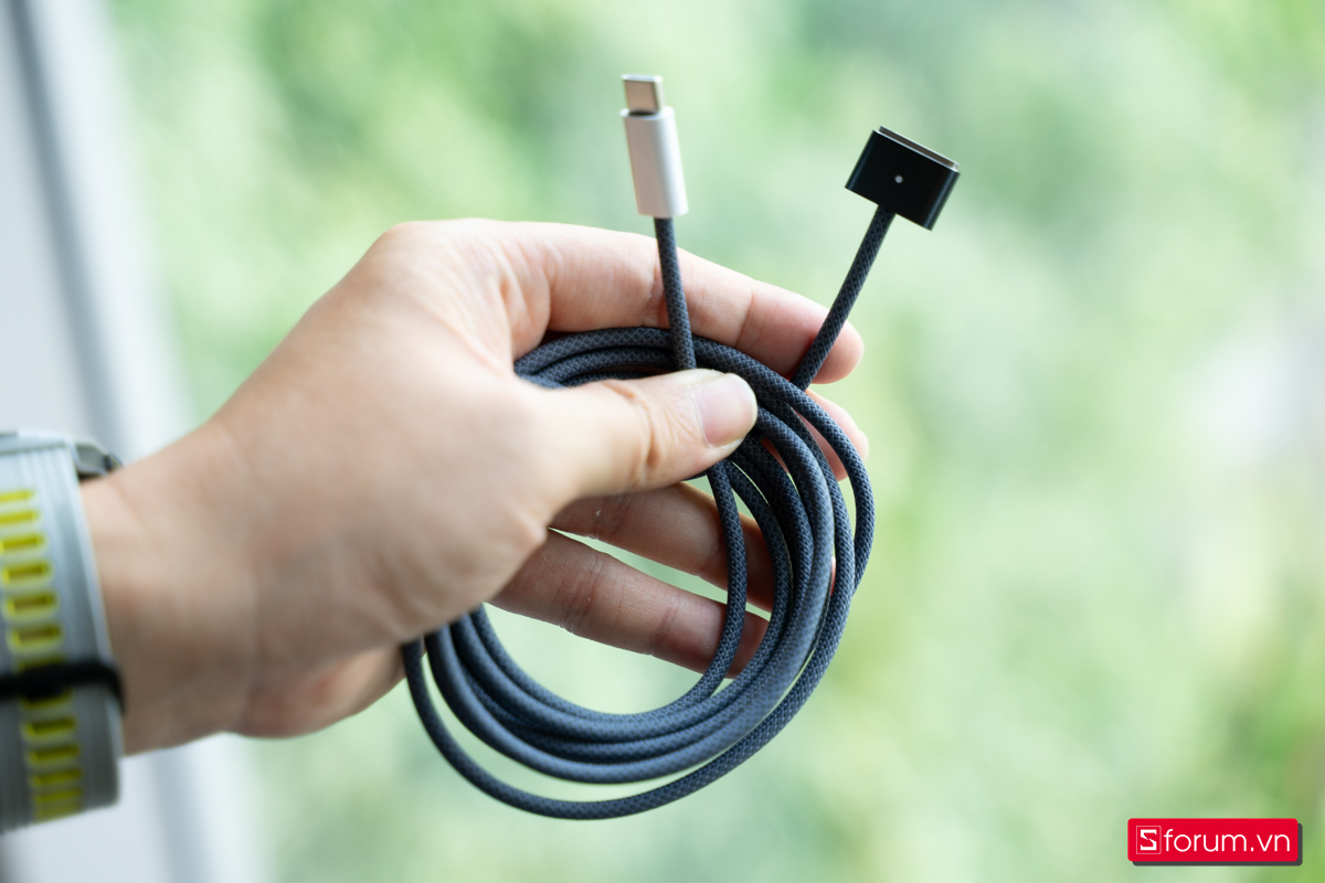 Bên dưới sẽ có một cục sạc cổng Type-C 35W, và một cuộn cáp bọc dù Type-C - Magsafe 2 cũng có màu Midnight tương tự đẹp mắt. Nếu bạn mú bản cao cấp hơn từ 512GB SSD và 10 nhân GPU thì sẽ được đi kèm với cục nguồn 2 cổng USB-C 35W, điều này cũng tương tự như nâng cấp phiên bản trên MacBook Air M2.