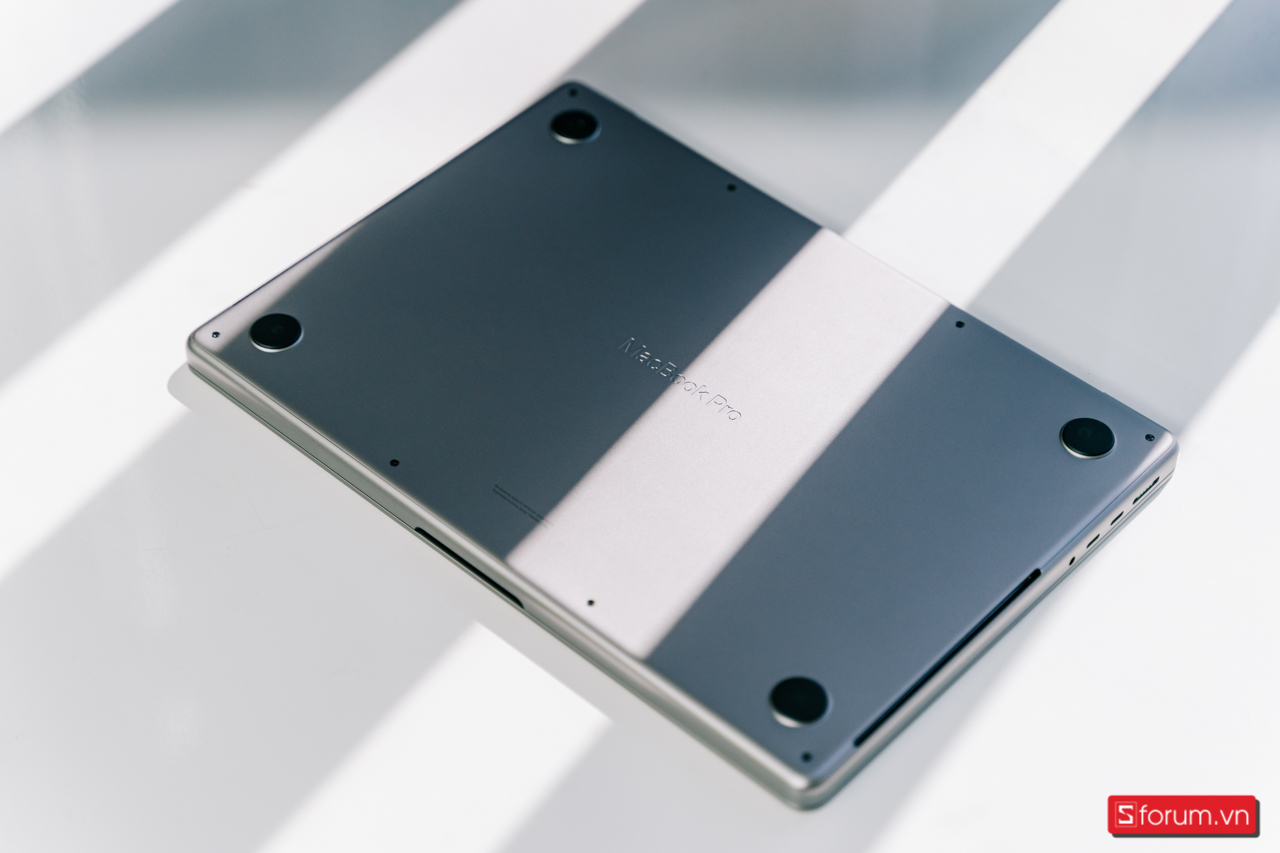 Mặt dưới có dòng chữ “MacBook Pro” được khắc vào thân máy nằm ngay chính giữa. Ở phía dưới có dòng chữ ghi các thông tin cơ bản về laptop. Cùng với đó chúng ta có thể thấy được máy có 2 khe tản nhiệt khá lớn và thực sự là khó 'nuốt' nổi cái thiết kế khi nhìn vào mặt sau của chiếc máy này, nhưng hiệu quả tản nhiệt thì chắc chắn sẽ tốt hơn trước rất nhiều.