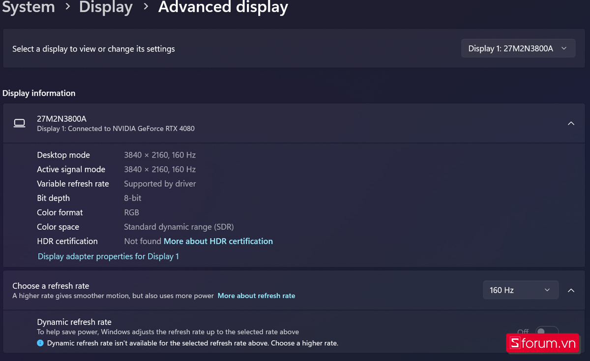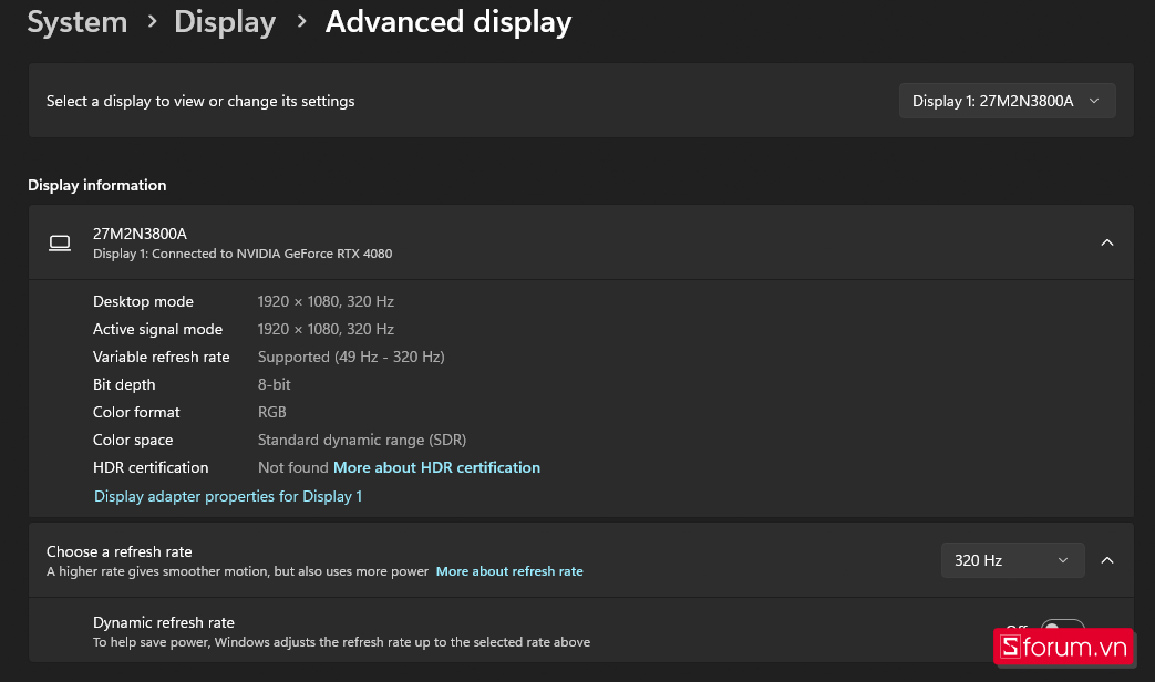 Màn hình hỗ trợ hiển thị lên tới 1,07 tỷ màu, hoạt động theo chuẩn 8-bit + FRC khi chạy ở chế độ 4K 160Hz hoặc Full HD 320Hz độ phủ màu sRGB 100%, cho dải màu rực rỡ và trung thực., rất hợp cho cả chơi game, xem phim và chỉnh sửa ảnh nhẹ.