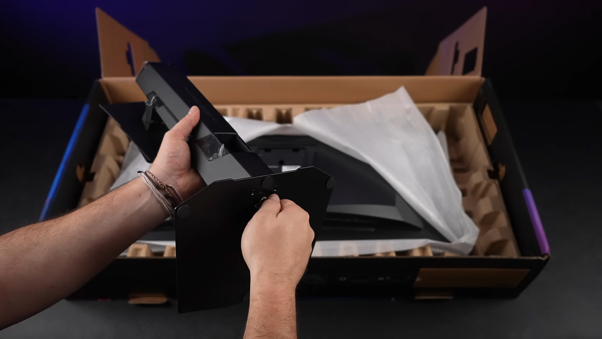 Khi lắp đặt bộ chân trụ và mặt đế, mình có thể tự tay vặn ốc mà không cần vít nhờ vào phần móc tròn gắn liền với ốc. Sau đó chỉ việc canh đúng phần khớp mặt sau màn hình, đưa phần ngàm của chân trụ và ấn nhẹ xuống là xong. Lắp ráp rất nhanh chóng, tiện lợi và nhẹ nhàng vô cùng.