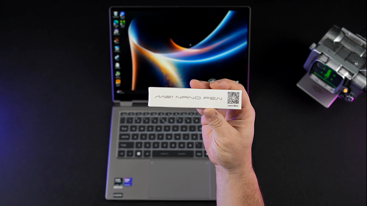 Bút cảm ứng MSI Nano Pen có thiết kế đúng nghĩa là “nano”, bởi nó khá nhỏ và mảnh mai. Đối với người dùng có tay to như mình, việc cầm MSI Prestige 14 Flip AI+ trên tay và cầm bút để chạm lướt ghi chút đôi lúc hơi mỏi. Nếu ngồi xuống sử dụng thì sẽ đỡ mỏi hơn nhiều. Mình đánh giá bút cảm ứng Nano Pen của MSI sẽ phù hợp với người tay nhỏ, hoặc phái nữ hơn.