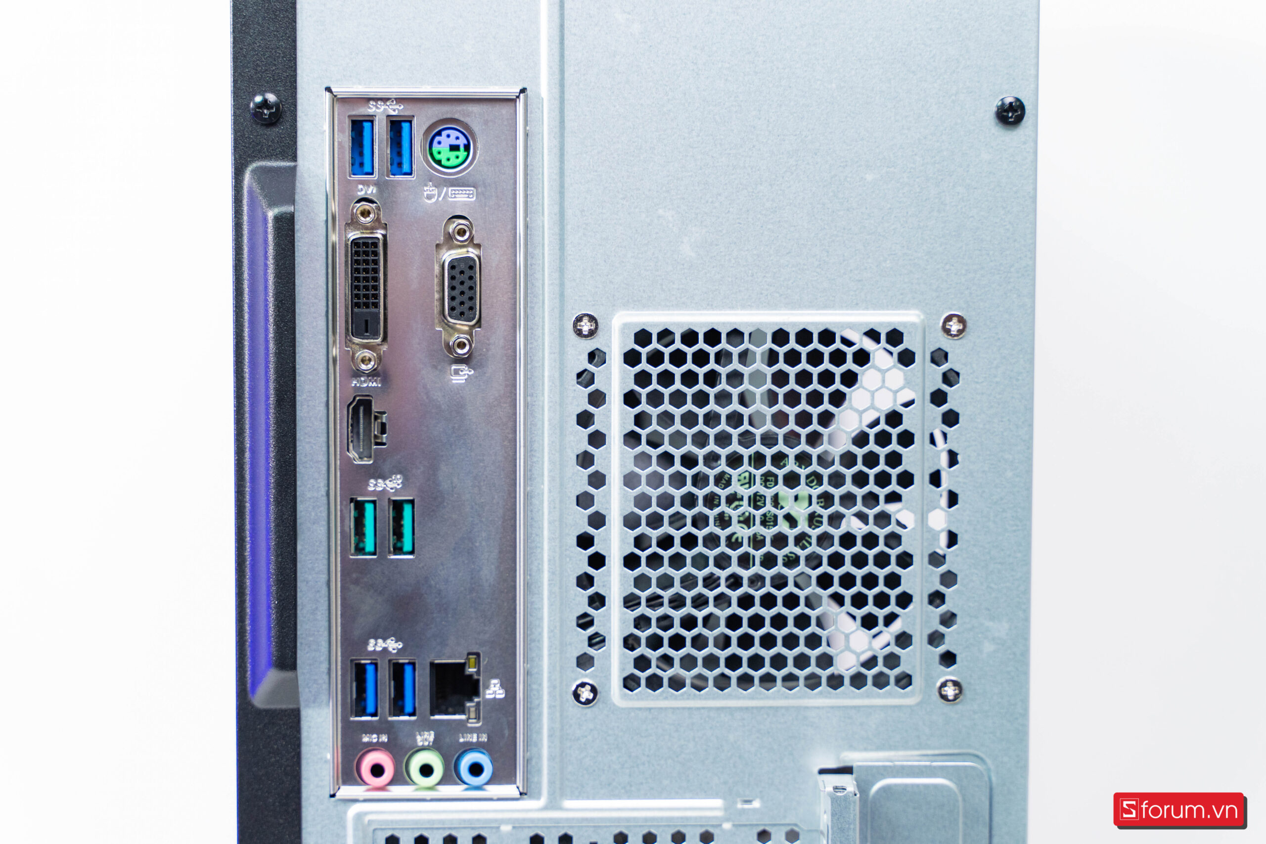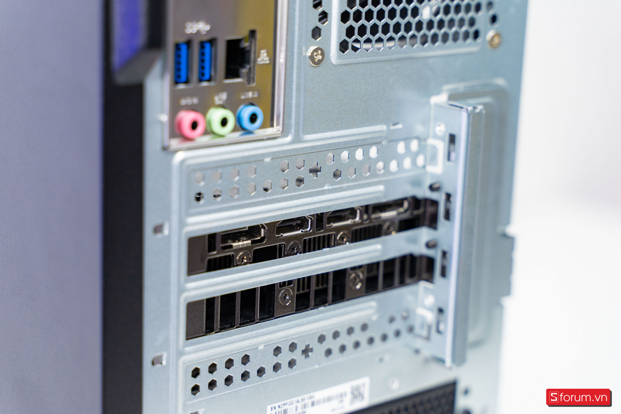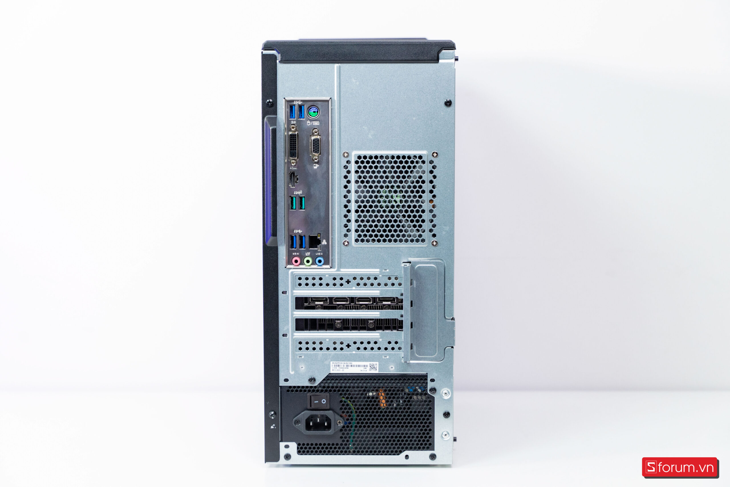 Ở mặt sau, ROG Strix G10DK cung cấp khá đầy đủ cổng kết nối bao gồm 6 cổng USB-A, trong đó 2 cổng màu xanh lá chuẩn USB 3.2 Gen 2 và 4 cổng màu xanh lam chuẩn USB 3.2 Gen 1, 1 x DVI-D, 1 x RJ45, 1 x HDMI 1.4, 1 x VGA và jack cắm âm thanh tích hợp 3 trong 1: micro, line in, line out, 2 cổng HDMI và 2 cổng DisplayPort ở phía dưới, đáng chú ý thiết bị có cổng PS2 cho chuột và bàn phím.