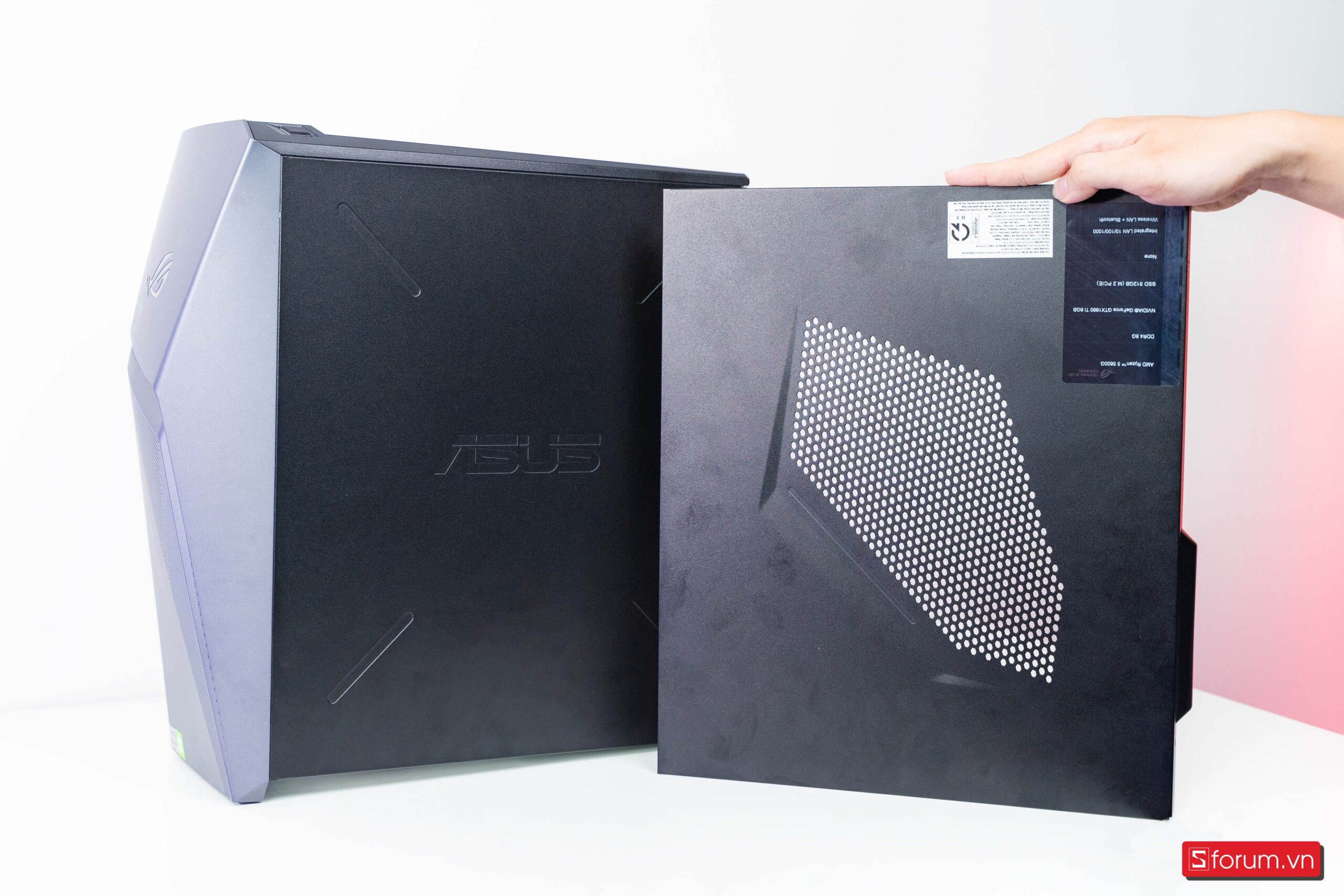 Mặt bên sườn của ROG Strix G10DK sử dụng tấm panel trong suốt đúng tiêu chuẩn thường thấy trên các dòng gaming. Khi lắp đặt, tấm panel này sẽ để hở một khoảng so với thùng máy để lưu thông khí tốt hơn. Mặt bên sườn của ROG Strix G10DK sử dụng tấm panel trong suốt đúng tiêu chuẩn thường thấy trên các dòng gaming. Khi lắp đặt, tấm panel này sẽ để hở một khoảng so với thùng máy để lưu thông khí tốt hơn. Nhưng nếu bạn không muốn quá phô trương thì hãng còn tặng kèm thêm tấm kim loại kín đáo, chỉ để hở lỗ khoét dạng tổ ong giúp thoát khí.