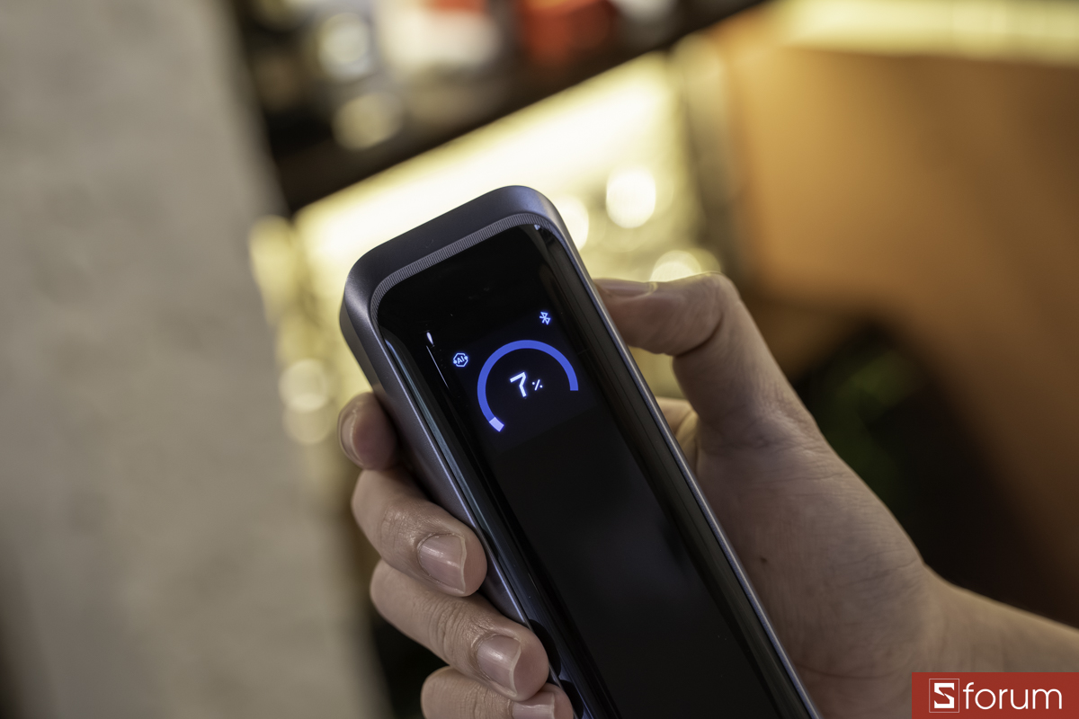 Màn hình đầu tiên hiển thị phần trăm pin tổng. Bấm sang sẽ là tùy chọn bật/tắt Bluetooth để kết nối ứng dụng. Tiếp theo là các màn hình hiển thị nhiệt độ hoạt động, cài đặt thời gian sáng màn hình và điều chỉnh độ sáng, hệ thống các cổng kết nối.