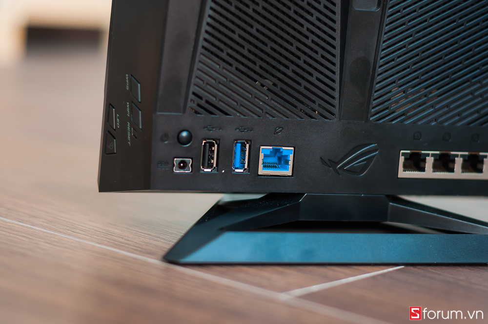 Ngoài ra còn có một cổng Internet, một cổng USB 3.0, một cổng USB 2.0, jack cắm nguồn và nút bật tắt nguồn. Cổng chơi game ROG cho phép các game thủ ưu tiên (các) thiết bị được kết nối với nó.