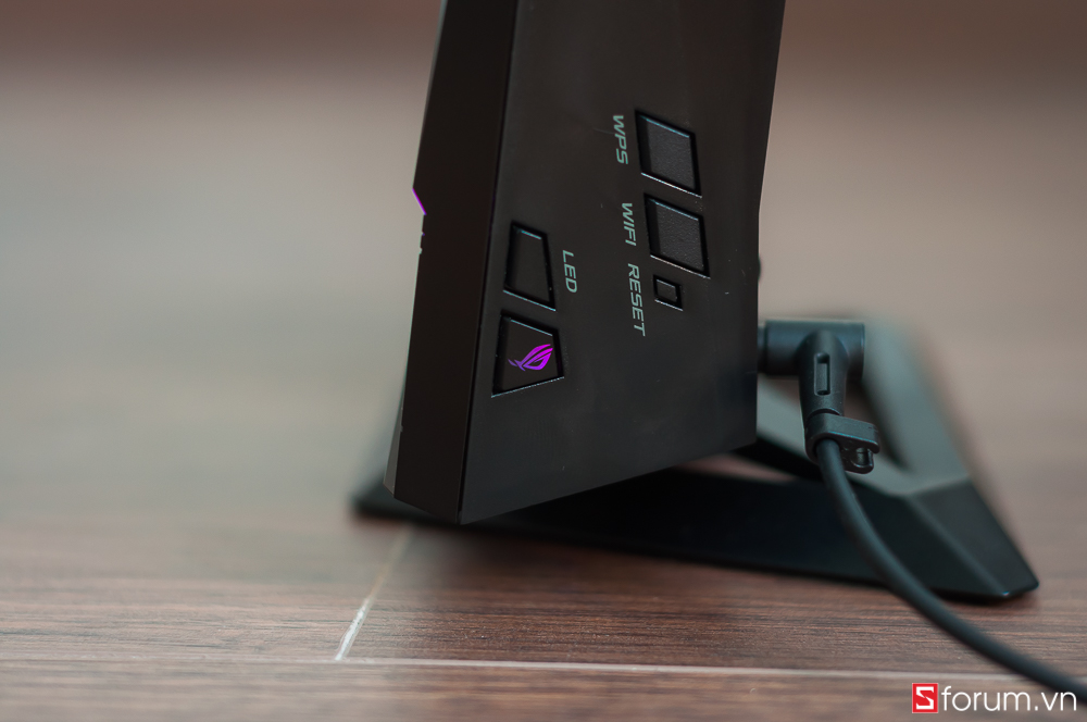 Mặt bên là nút logo ROG (có tên Boost Key) có thể được tùy chỉnh để thực hiện các hành động cụ thể khi nhấn. Cạnh đó là nút điều khiển dàn LED ở mặt trước, nút WPS, WiFi và nút Reset.