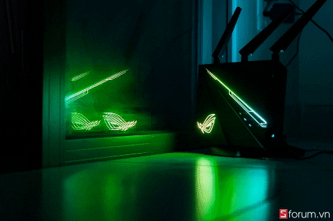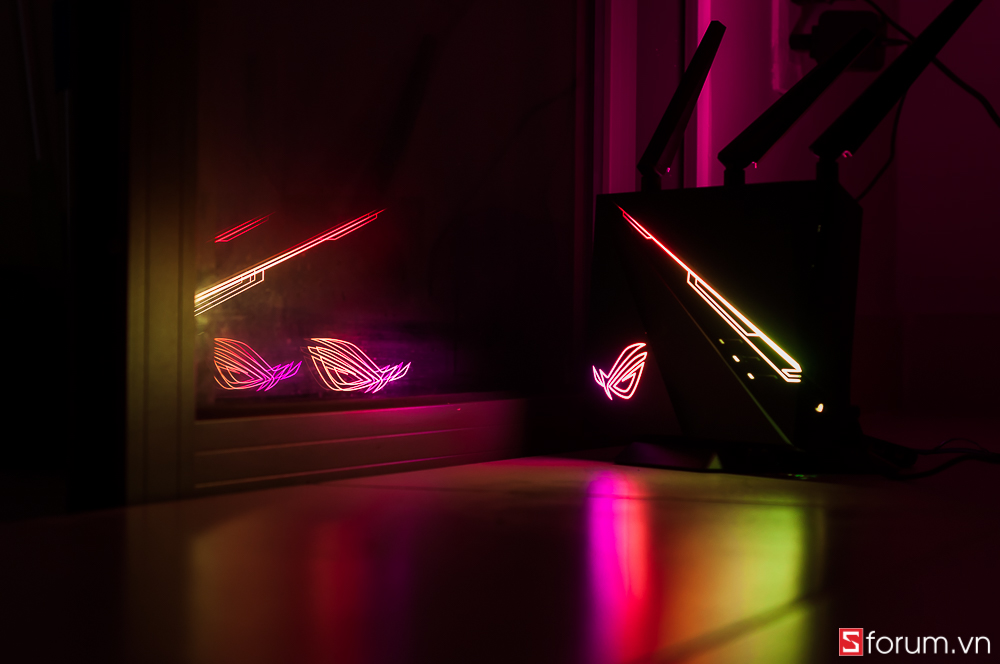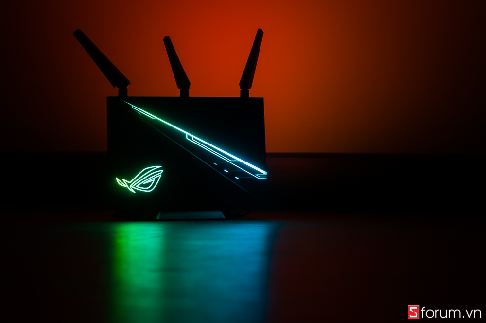 Mặt trước là dàn LED RGB lần đầu xuất hiện trên mẫu router của Asus. LED được tích hợp bên dưới logo ROG, họa tiết trang trí bắt mắt, và các đèn báo chức năng. Thiết kế mạnh mẽ,