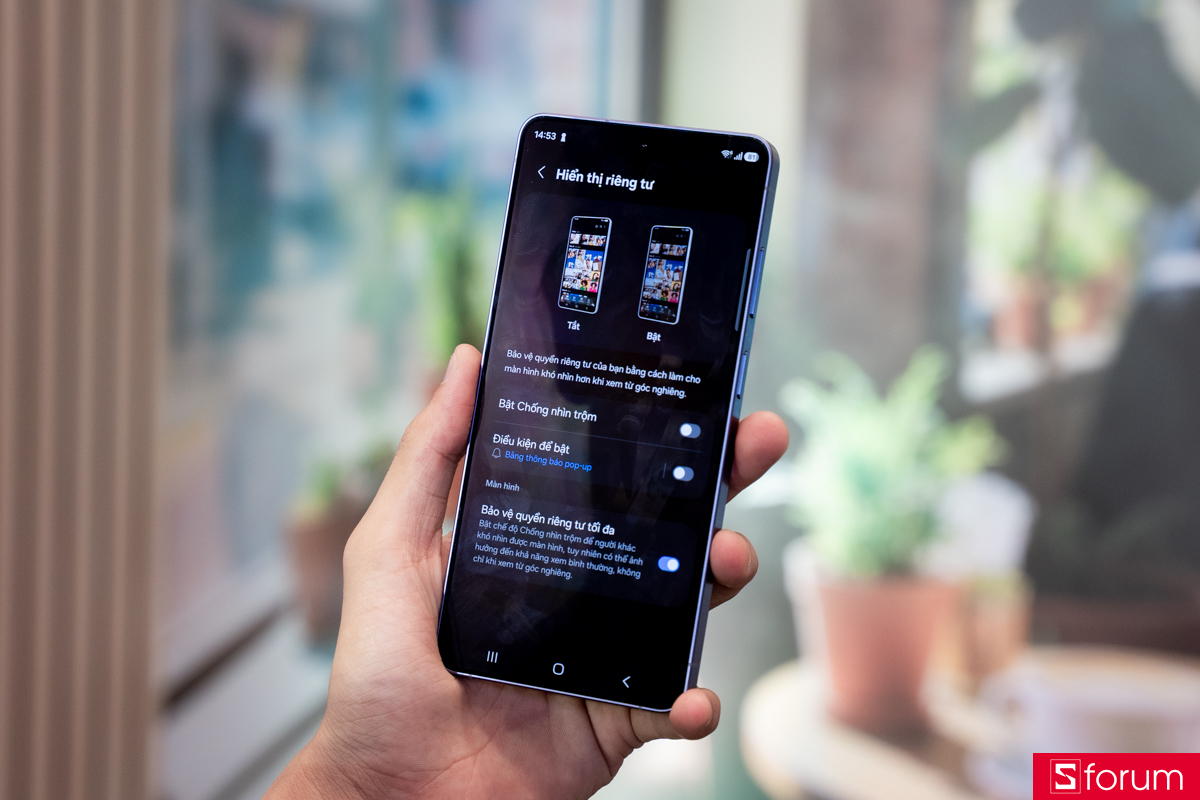 Khi bật tính năng này lên, màn hình của máy sẽ hạn chế góc nhìn nghiêng ở cả 4 chiều. Khi có người bên cạnh nhìn vào, màn hình của máy sẽ tối lại, đảm bảo sự riêng tư cho bạn sử dụng điện thoại ở nơi công cộng hay bất kỳ đâu. Tính năng này có thể bật tắt nhanh chóng, tùy chỉnh theo ứng dụng và tuỳ chỉnh thông báo, giúp người dùng thoải mái khi sử dụng máy.