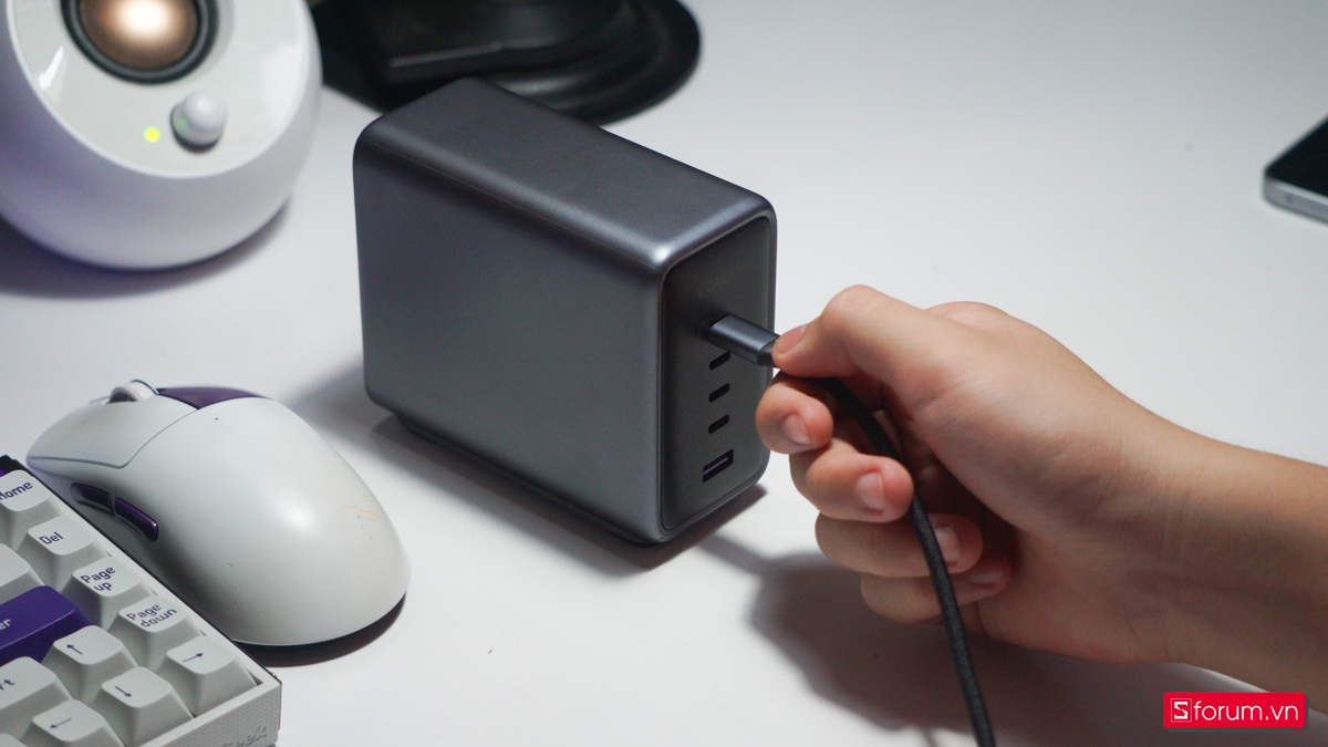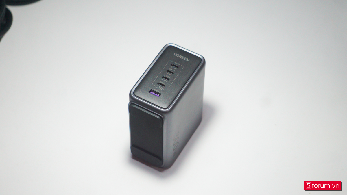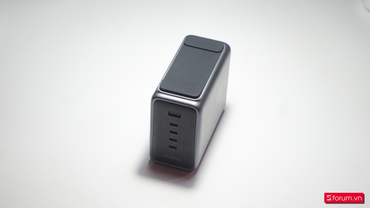 Mặt trước của trạm sạc được bố trí 4 cổng USB-C và 1 cổng USB-A, các cổng được tách nhau với một khoảng cách vừa đủ để có thể cắm được nhiều lúc nhiều loại dây khác nhau mà không bị chật hay bí chỗ.