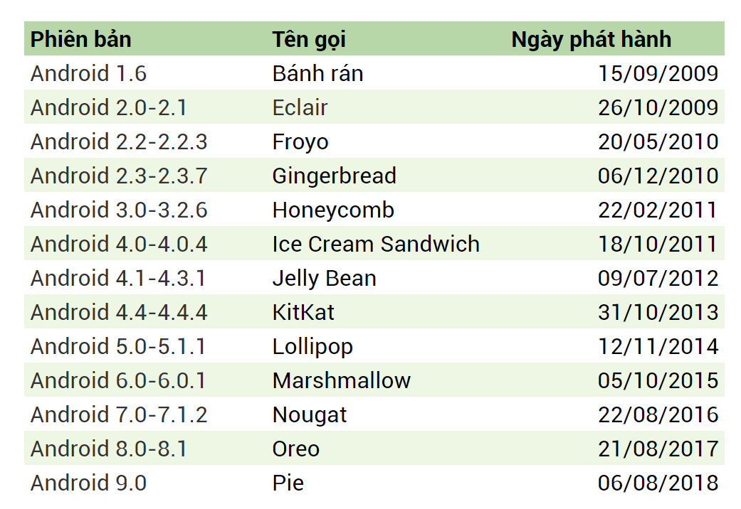 Tiếp theo sau đây là các phiên bản và các mốc thời gian được ra đời của Android: