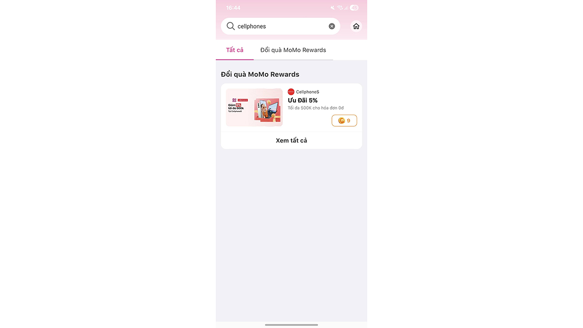 - Bước 2: Click vào mục "MOMO XU" tìm kiếm "CELLPHONES" đổi xu.