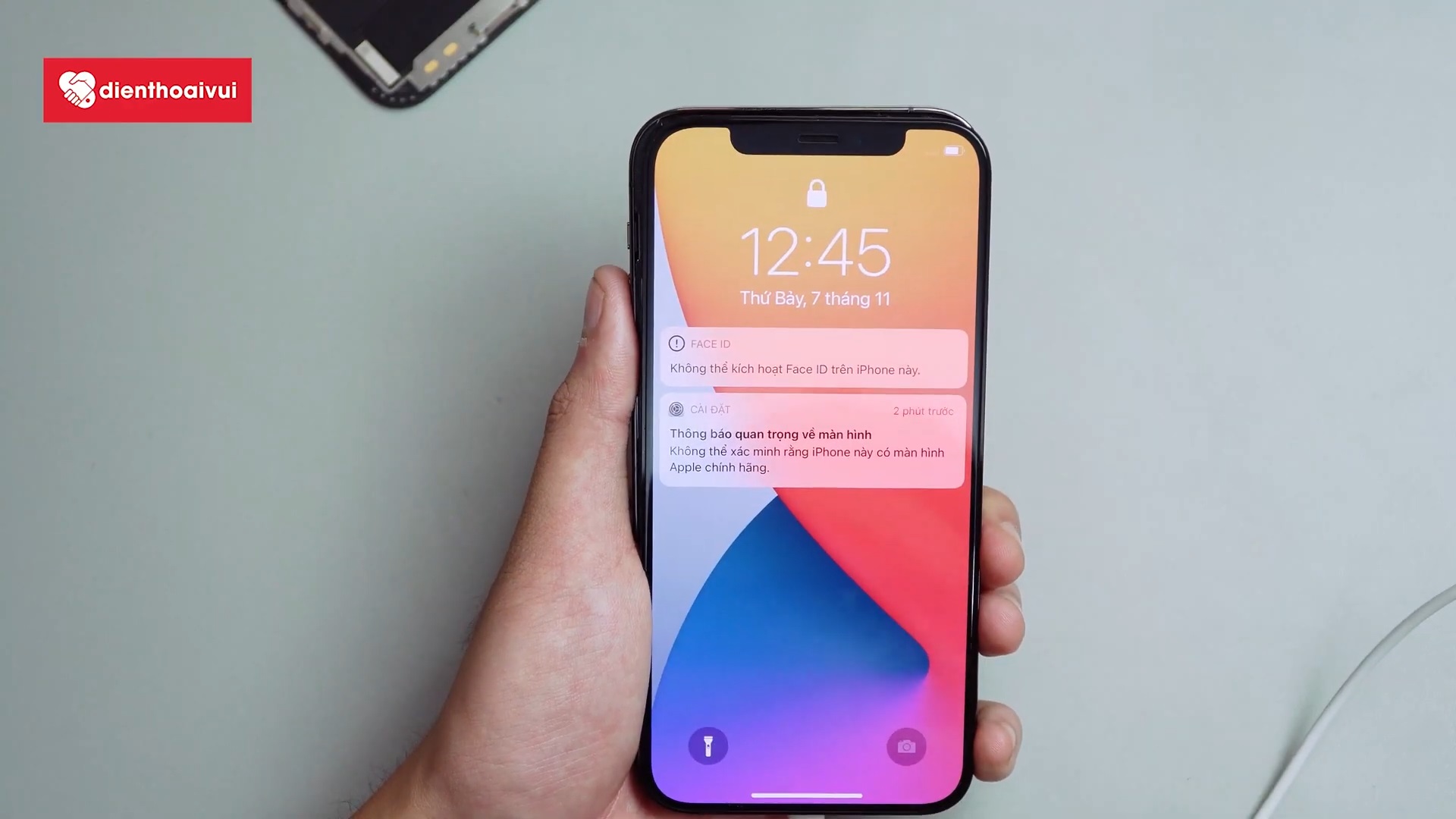 Tiếp đến là là tháo hết các linh kiện của 2 chiếc iPhone 12 Pro và đưa main của iPhone 12 Pro trắng qua iPhone 12 Pro đen. Lúc này chiếc iPhone 12 Pro đen đã có thể khởi động lên được, tuy nhiên hệ thống bắt đầu thông báo không thể kích hoạt Face ID và Không thể xác thực rằng iPhone này có màn hình chính hãng.