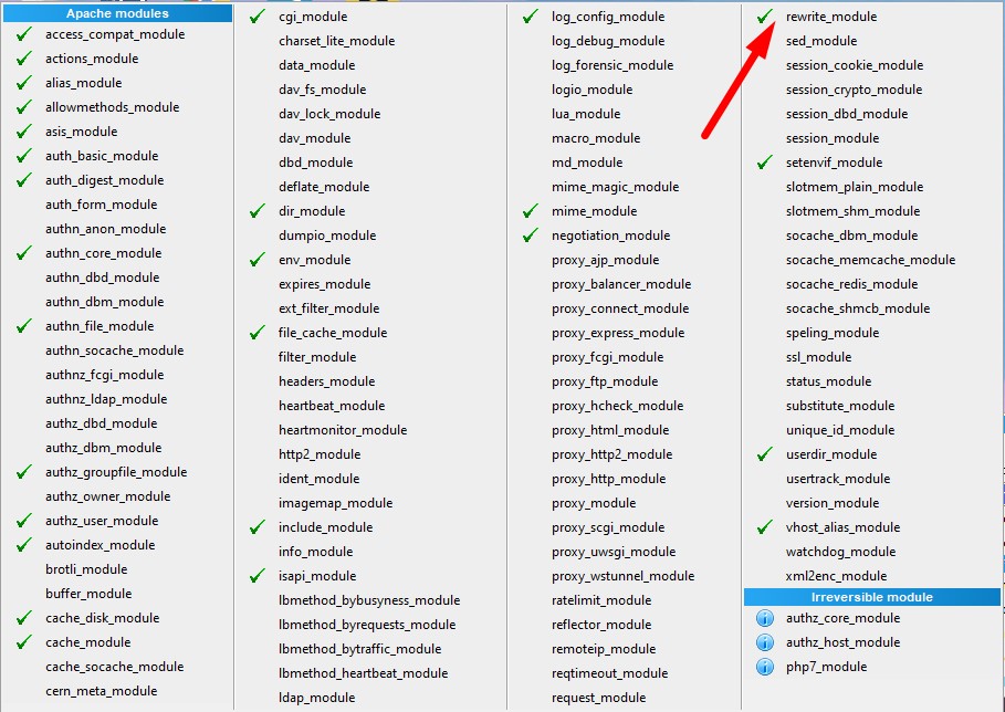 Bước 2: Sau đó, bạn tìm và bấm chọn vào Rewrite_module, lúc này phần mềm WAMPServer sẽ thay đổi tệp httpd.conf và tự động khởi động lại Apache.