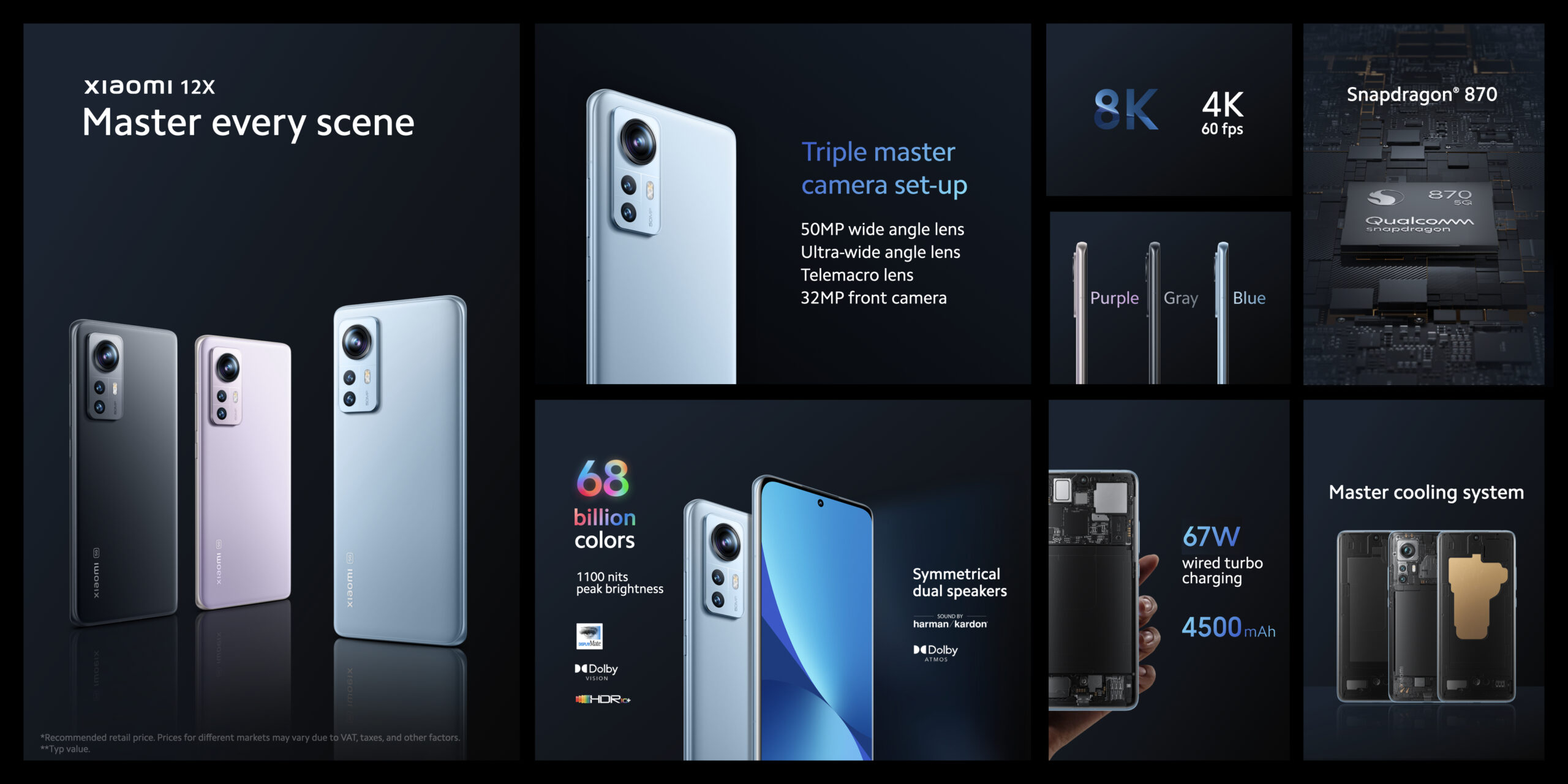 - Xiaomi 12X có hai phiên bản, 8GB+128GB, 8GB+256GB, chính thức mở bán với giá từ $649 (khoảng 14.9 triệu đồng).