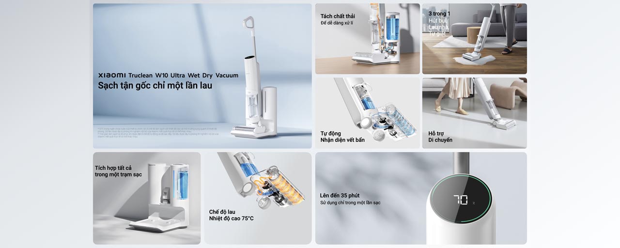 Đáp ứng mọi nhu cầu của người dùng, Xiaomi cung cấp hai phiên bản khác nhau với nhiều tính năng khác biệt. Với Truclean W10 Ultra Wet Dry Vacuum, Xiaomi trang bị chế độ lau nhiệt độ cao lên đến 75 độ C cho phép người dùng làm sạch mọi vết bẩn một cách kỹ lưỡng hơn. Sản phẩm cũng tích hợp nhiều tính năng như khả năng tự động làm sạch, tự đổ đầy nước, tự động làm khô trong một trạm sạc thông minh.