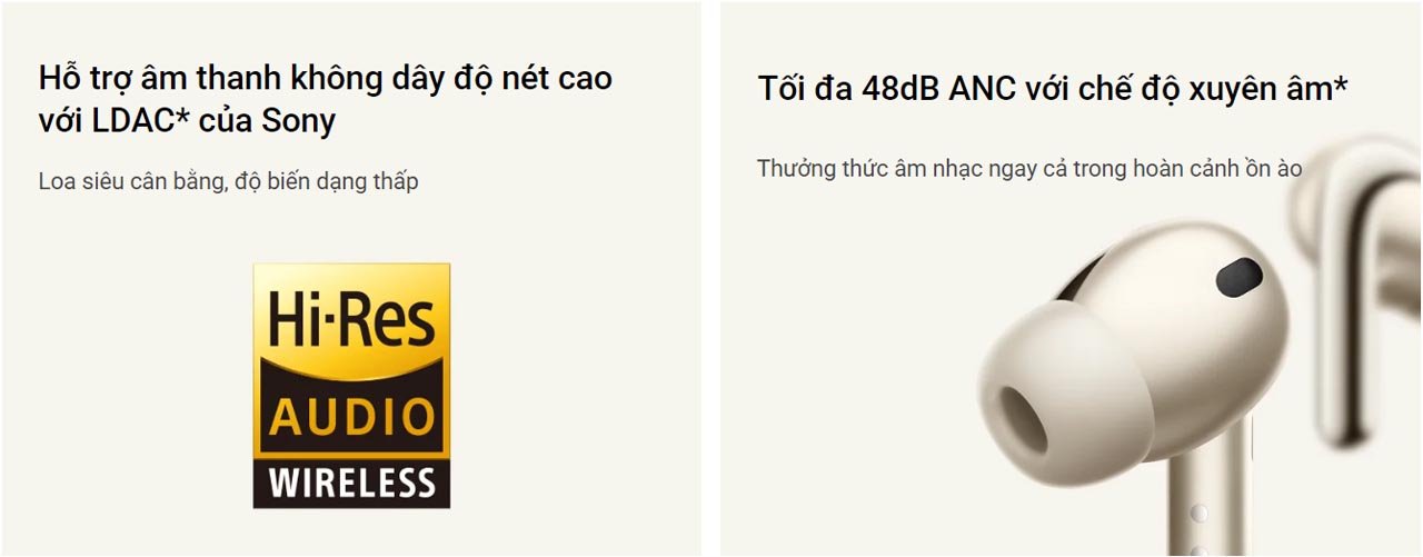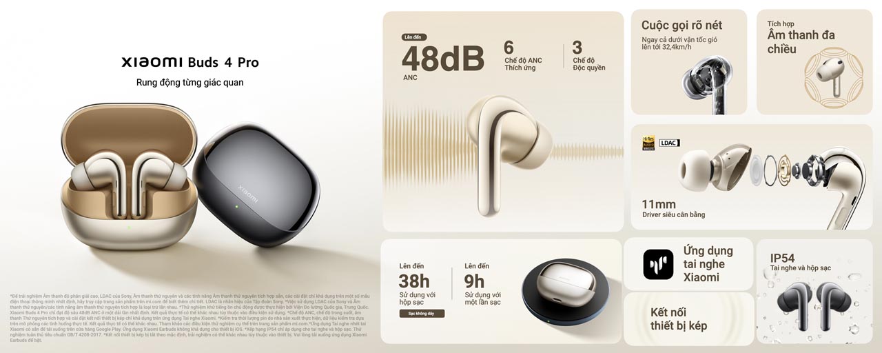 Xiaomi Buds 4 Pro tích hợp công nghệ âm thanh LDAC của Sony với tốc độ truyền dữ liệu lên đến 990kbps và độ sâu bit lên tới 32-bit. Bên cạnh đó, sản phẩm cũng sở hữu tiêu chuẩn âm thanh không dây chất lượng cao Hi-Res Audio Wireless, mang đến trải nghiệm âm thanh chân thực và trọn vẹn nhất. Xiaomi Buds 4 Pro cũng có khả năng khử tiếng ồn ấn tượng với độ sâu lên tới 48dB.