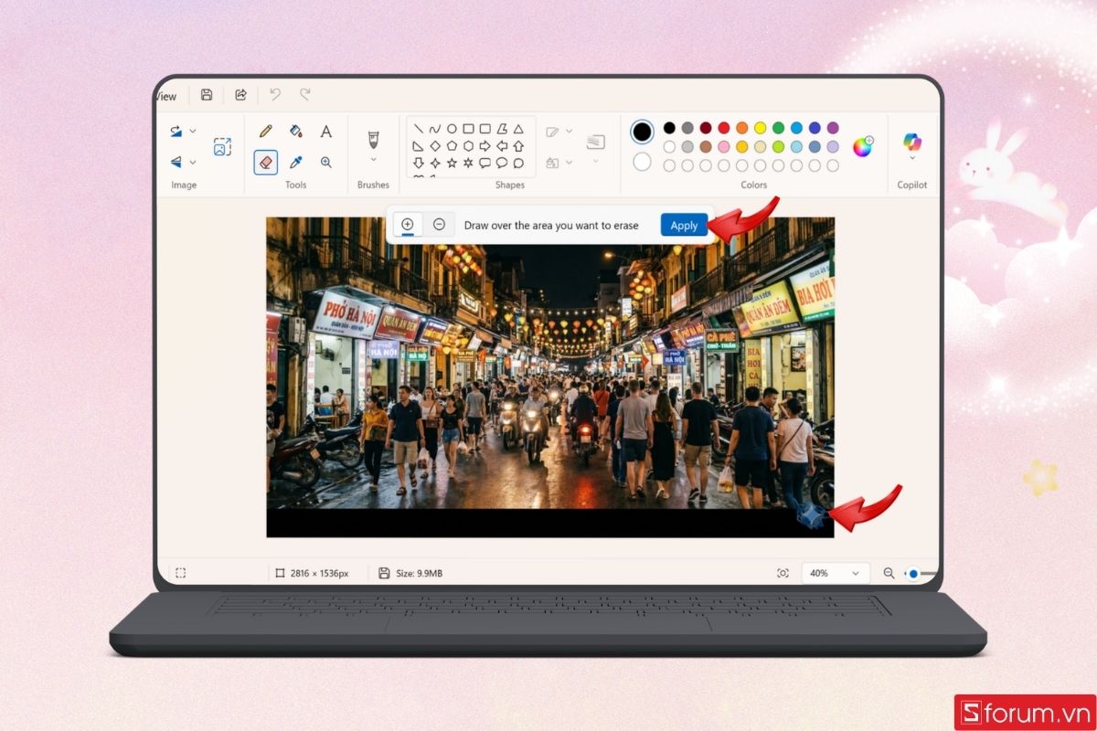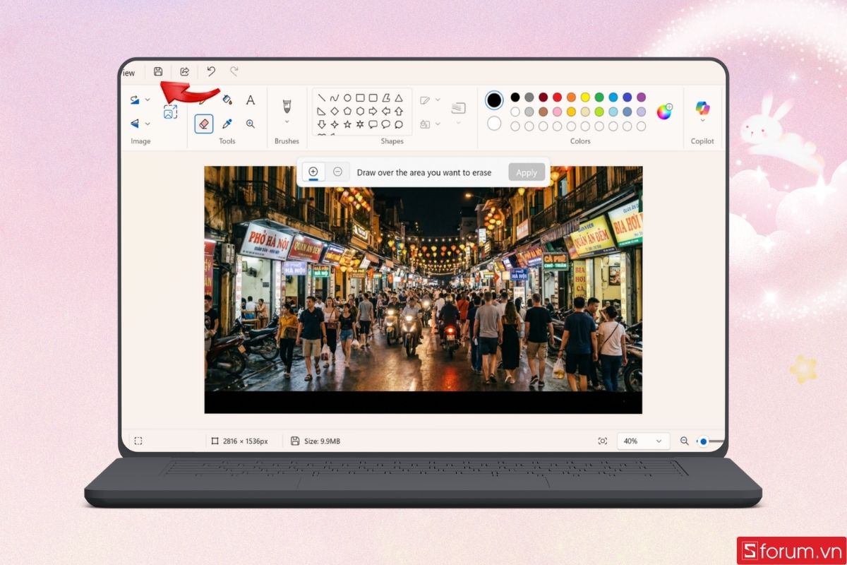 Sau khi chọn ảnh, bạn bấm chọn Copilot > Generative Erase. Dùng cọ tô đậm lên khu vực chứa logo, trí tuệ nhân tạo sẽ tự động bù đắp không gian bằng các mảng màu nền liền mạch nhất. Sau đó bạn chỉ cần lưu ảnh về là hoàn tất quá trình xóa.