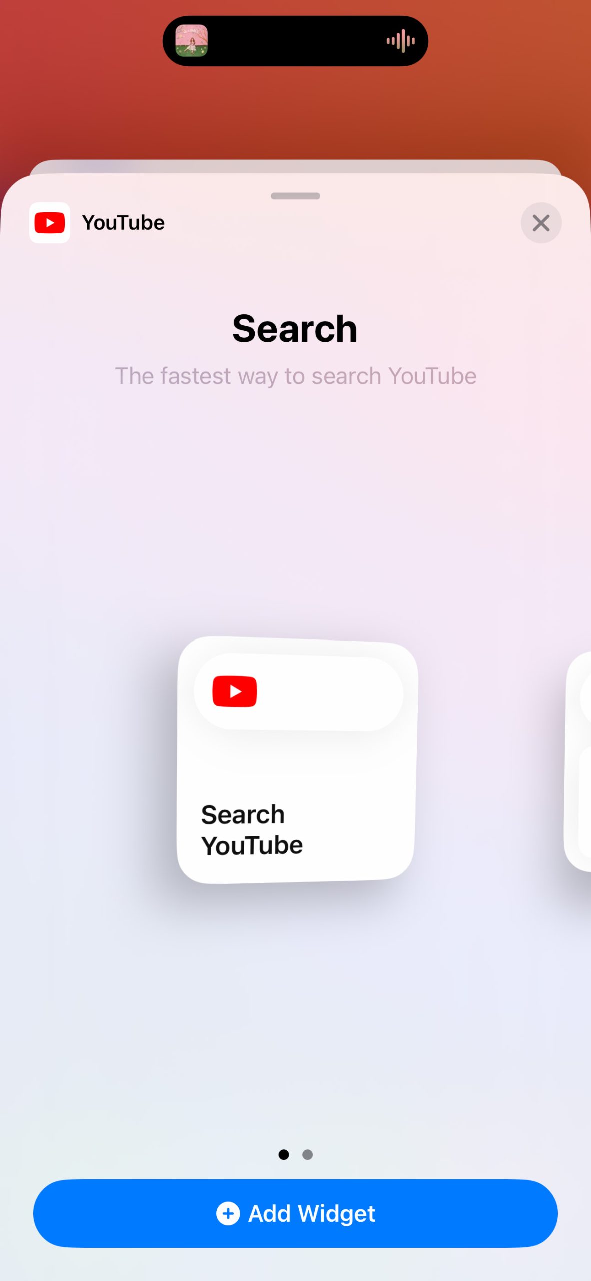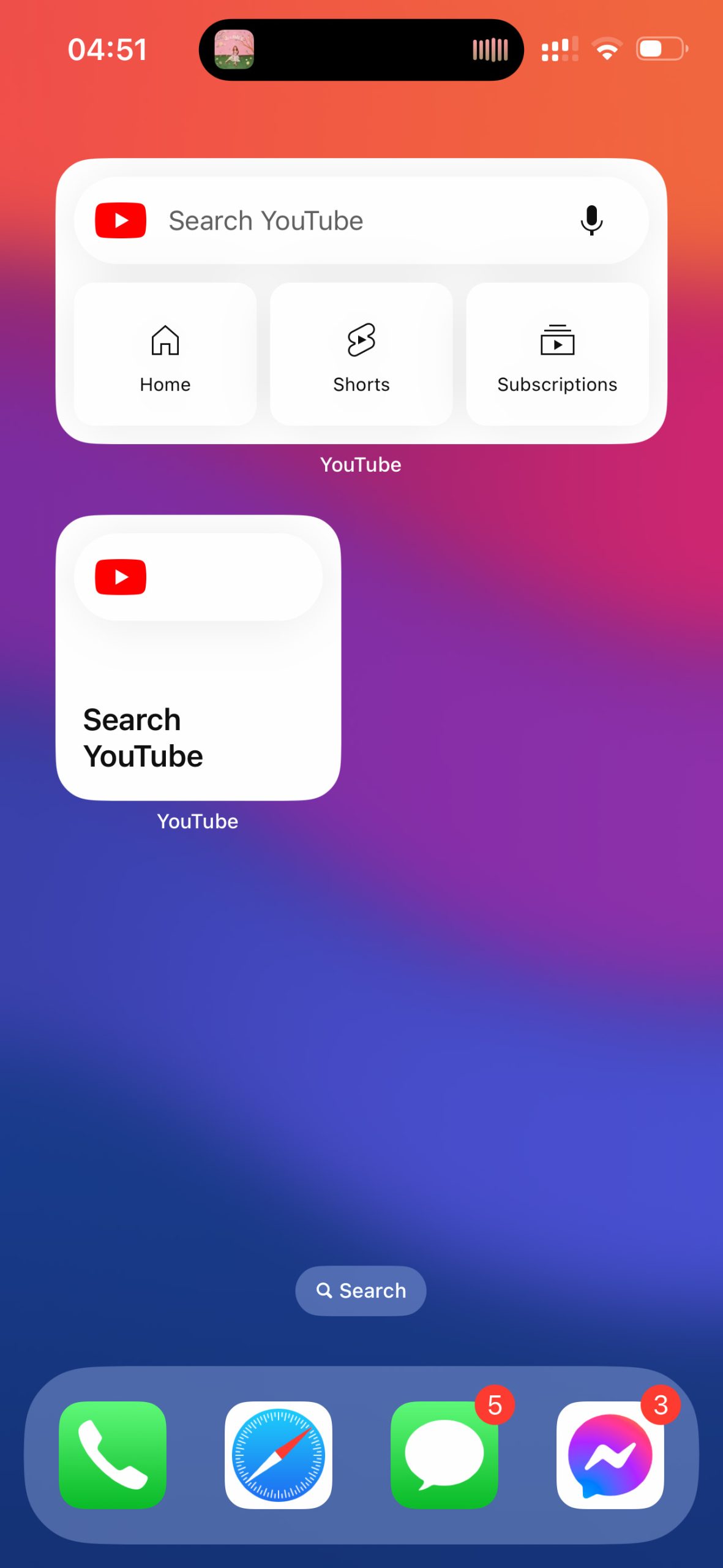 Widget thứ hai có tên là 'Search' với kích thước 2x2, được xem như phiên bản rút gọn của Quick Actions, chỉ chứa trường tìm kiếm trên YouTube bằng cách nhập văn bản.