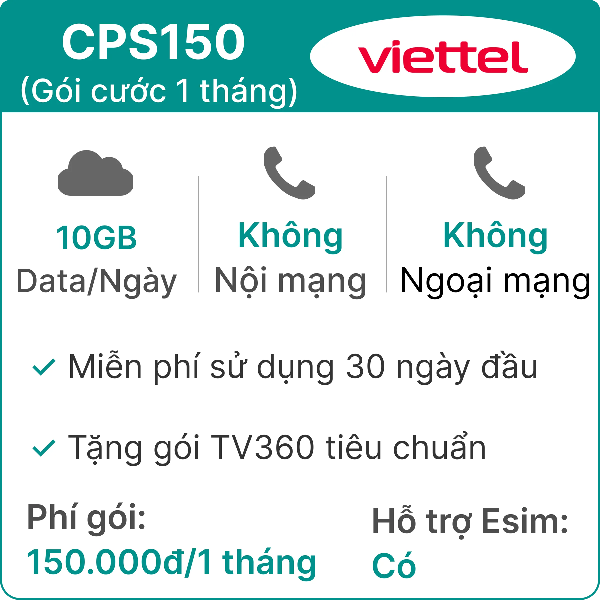 Sim 5G Viettel CPS150 10GB/Ngày - Gói 1 tháng mang đến Internet tốc độ cao vượt trội với dung lượng 10GB/ngày, miễn phí gói TV360 tiêu chuẩn và chu kỳ 1 tháng. Sản phẩm Sim Viettel còn có tính năng tự động gia hạn khi đủ cước, hỗ trợ Esim, 30 ngày sử dụng miễn phí đầu.