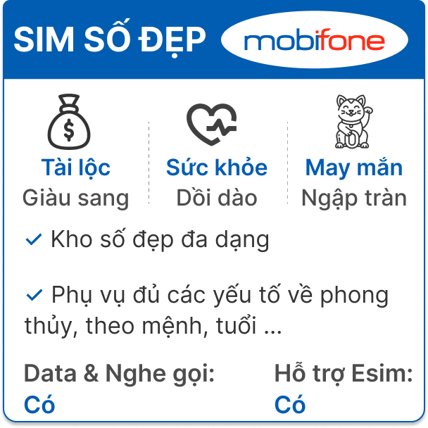 Mobifone hiện đang là một trong những dịch vụ viễn thông được nhiều người Việt Nam lựa chọn và tin dùng nhất nhờ sở hữu những tiện ích về liên lạc và đặc biệt là sim số đẹp Mobifone. Với kho tàng sim số đẹp đa dạng, hợp phong thuỷ phục vụ đủ các yếu tố về mệnh, tuổi, phong thuỷ, sim số đẹp của Mobifone sẽ là một sự lựa chọn không thể bỏ qua với những bạn sử dụng nhà mạng Mobifone và muốn lựa cho mình một chiếc Sim số đẹp. Cùng mình tìm hiểu ngay về những chiếc sim Mobifone số đẹp qua những thông tin dưới đây nhé!
