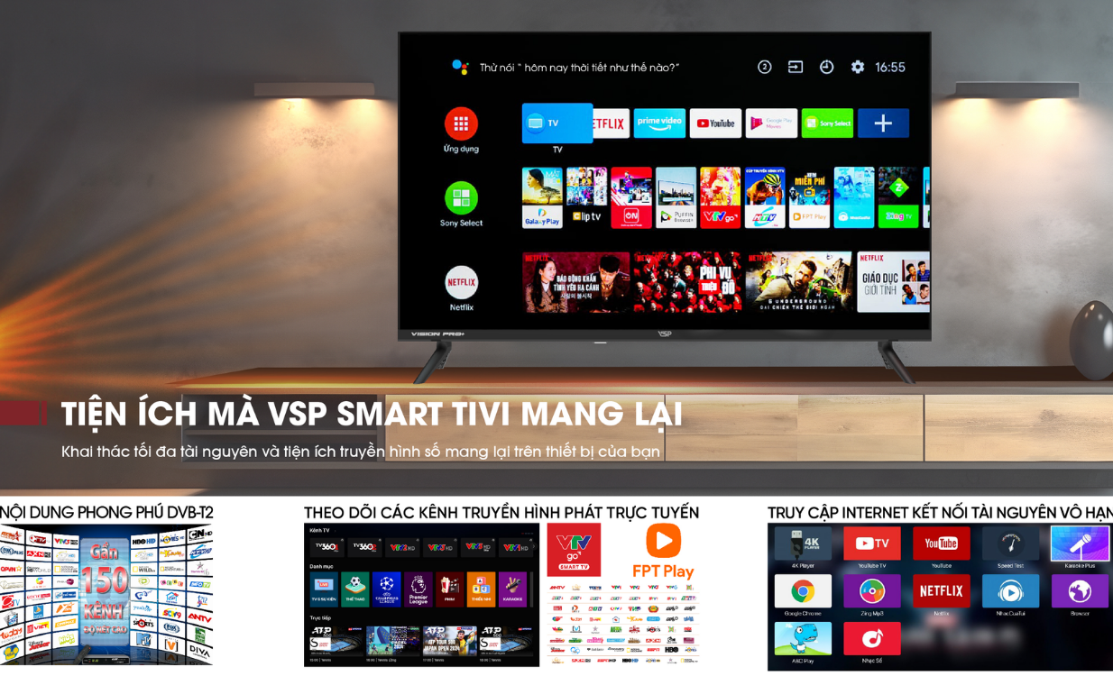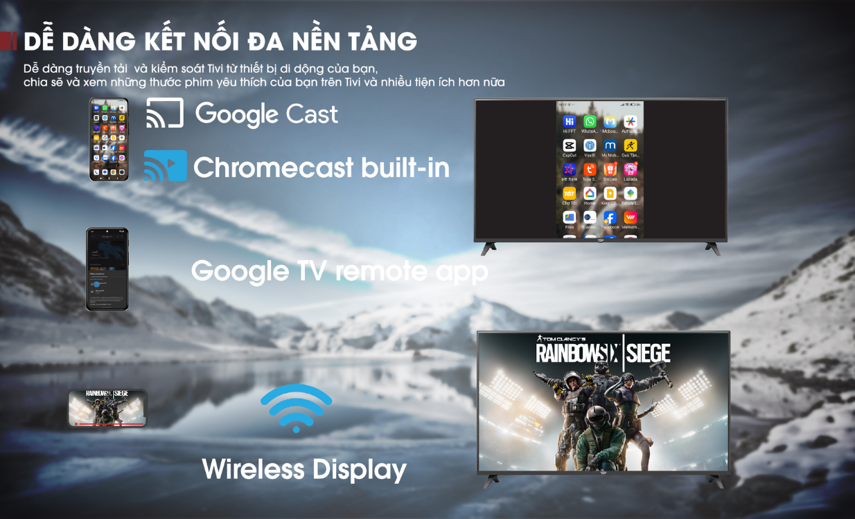 | Tiện ích nổi bật | Tìm kiếm giọng nói bằng tiếng Việt, Điều khiển bằng giọng nói không cần remote, Chiếu hình ảnh từ điện thoại lên TV |