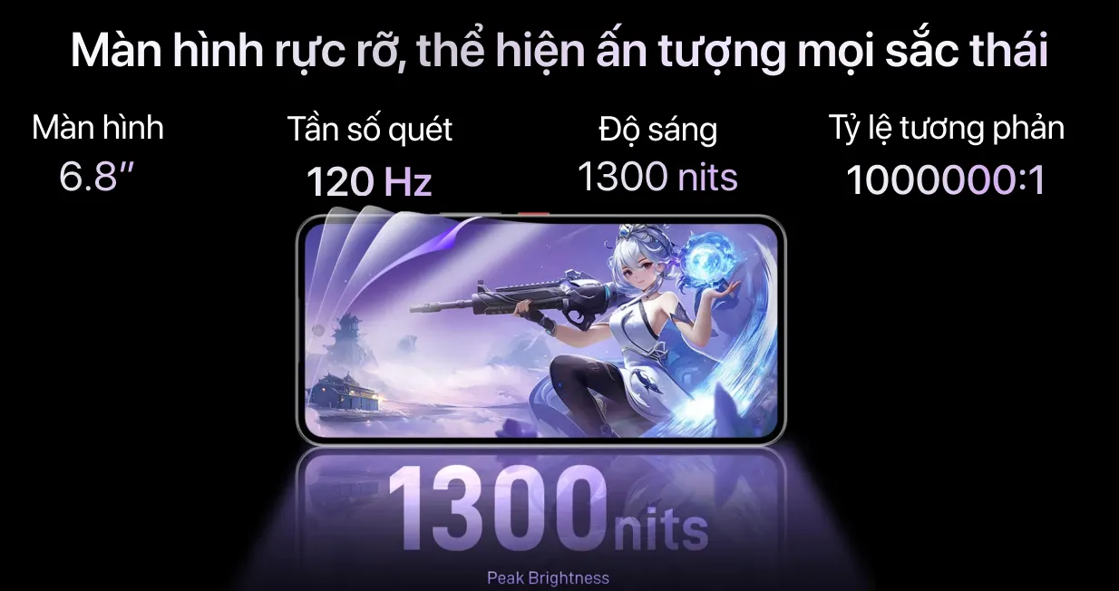 | Tính năng màn hình | Tính năng màn hình FullHD+ Tần số 120Hz Độ sáng cực đại 1300 nit Gam màu DCI-P3 100% Tỷ lệ tương phản 1000000:1 Tần số lấy mẫu cảm ứng tức thời 1200Hz |