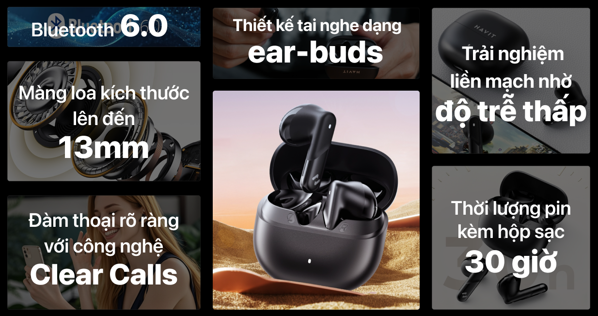Tai nghe Bluetooth Havit Life 04T TW888 sử dụng trình điều khiển lớn 1.3cm, giúp âm thanh có độ sâu và độ rộng rõ rệt. Cấu trúc màng loa lớn tăng cường âm trầm, tái hiện hiệu ứng bass dày, lan tỏa. Âm trung và cao được cân bằng hợp lý, mang đến trải nghiệm nghe đa dạng từ nhạc nhẹ, pop đến các bản phối có tiết tấu mạnh.