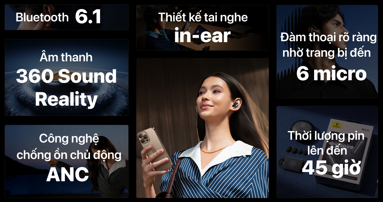Công nghệ khử ồn chủ động (ANC) tự điều chỉnh theo môi trường và cấu trúc ống tai, giúp giảm tiếng ồn hiệu quả trong không gian ồn ào. Bên cạnh đó, thiết bị còn sở hữu hệ thống 6 micro tích hợp AI ENC hỗ trợ lọc nhiễu gió và tạp âm, giữ chất lượng đàm thoại luôn rõ nét.