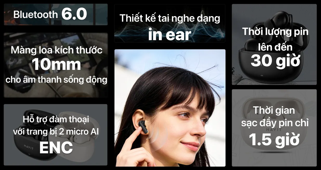 Tai nghe Bluetooth True Wireless Havit TW907 SE - Âm thanh sống động, kiểu dáng tiện lợi